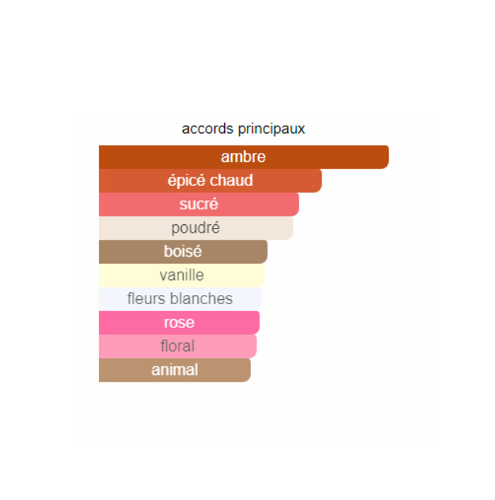 les notes de fond sont Ciste, Ambre, Bois de santal, Fève de tonka, Opoponax, Civette et Vanille.