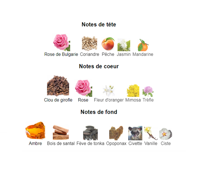 Les notes de tête sont Coriandre, , Mandarine, Pêche , Jasmin et Rose de Bulgarie
