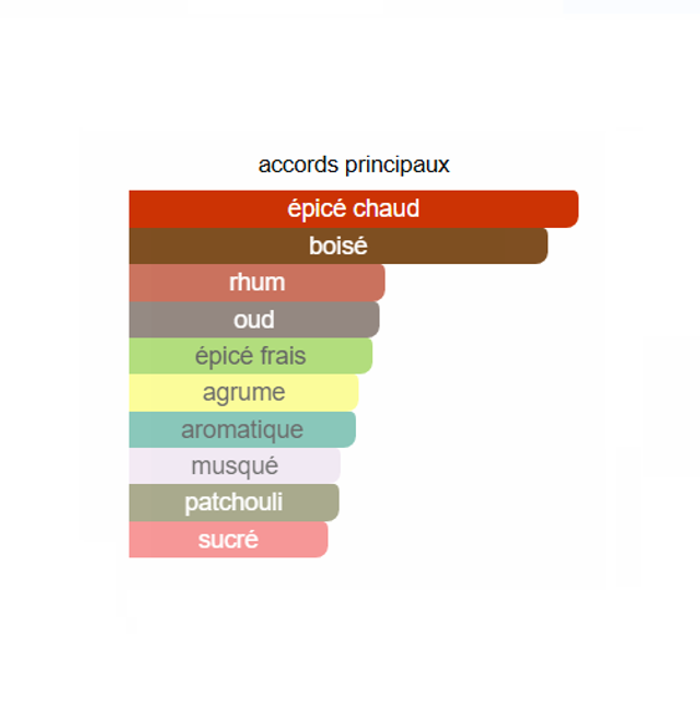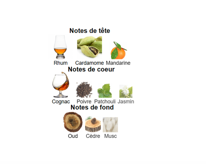 Les notes de tête sont Cardamome, Mandarine et Rhum