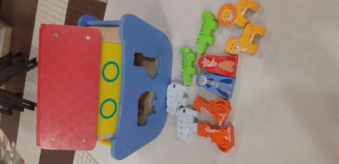 arche de noé avec formes à encastrer, 2 éléphants, 2 personnages, 1 lion et 1 lionne, 2 crocodiles, 2 guépards