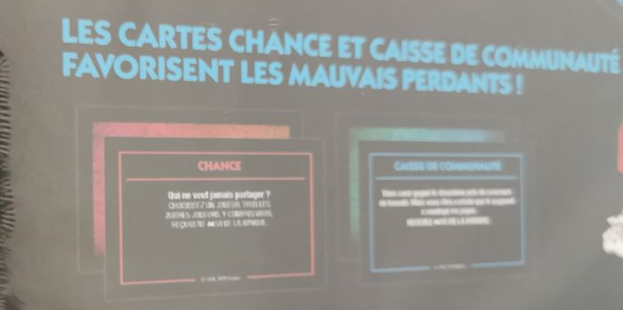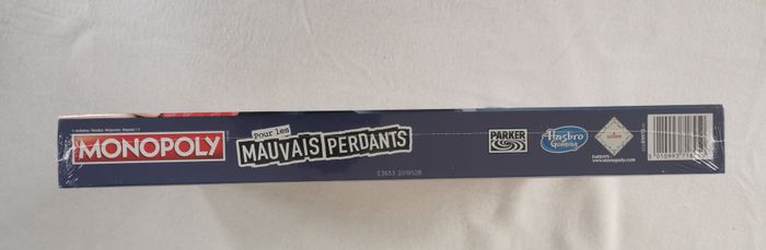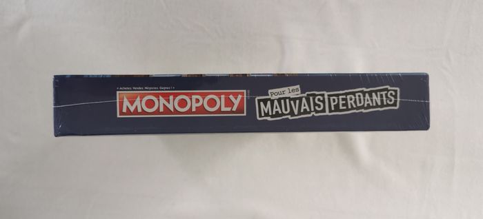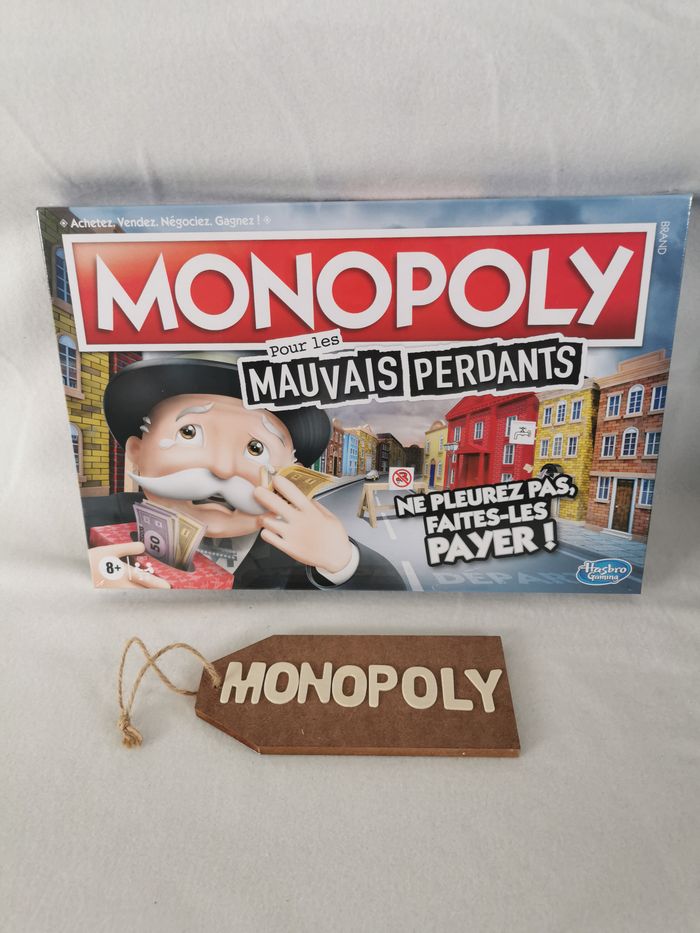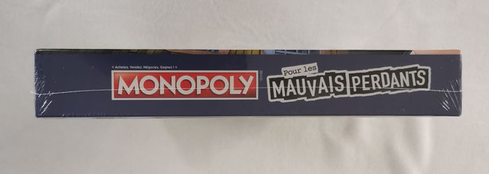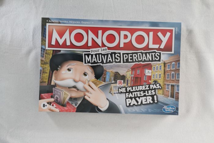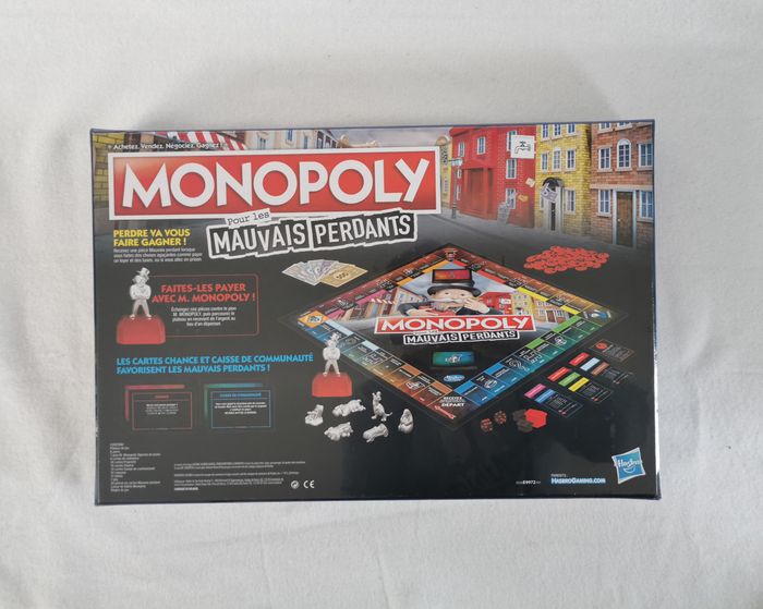 LA JOIE DE PERDRE : Généralement, il est dur de perdre, mais maintenant c'est plutôt rigolo ! Les cartes Chance et Caisse de communauté favorisent les mauvais perdants. Inclut plateau de jeu, 6 pions, 1 pion M. Monopoly (figurine et socle), 6 cartes de référence, 26 titres de propriété, 16 cartes Chance, 16 cartes Caisse de communauté, 32 maisons, 12 hôtels, 2 dés, 30 pièces Mauvais perdant, liasse de billets et règles du jeu.