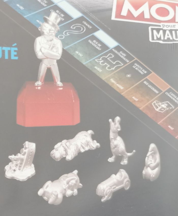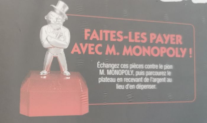 PION M. MONOPOLY : Perdre n'est que le début ! Dès qu'on a 4 pièces Mauvais perdant, on peut les échanger à la banque pour utiliser le pion M. Monopoly qui permet de « piétiner » les joueurs et de réclamer de l'argent au lieu d'en payer.