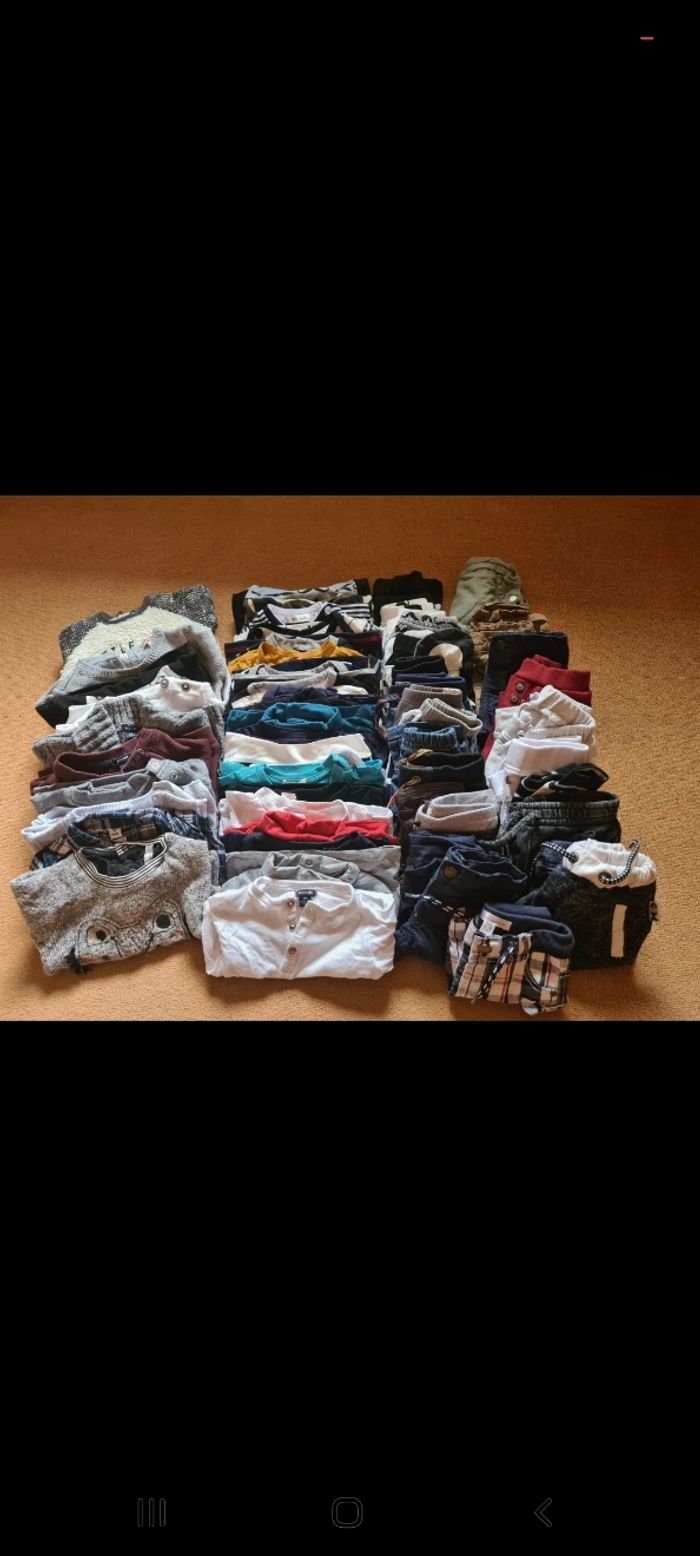 gros lot comprenant 6 pulls 3 sweats 1 chemise ML 23 tee shirts ML 1 salopette 1 short 22 pantalons