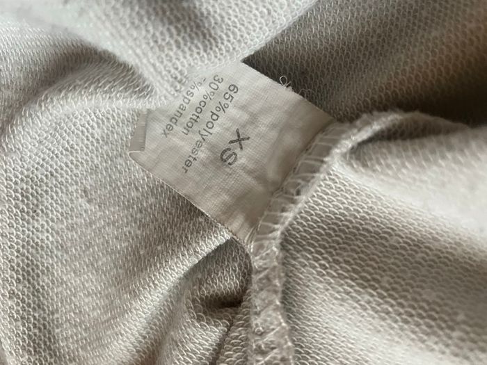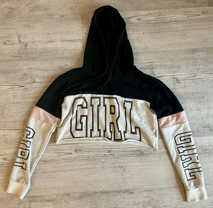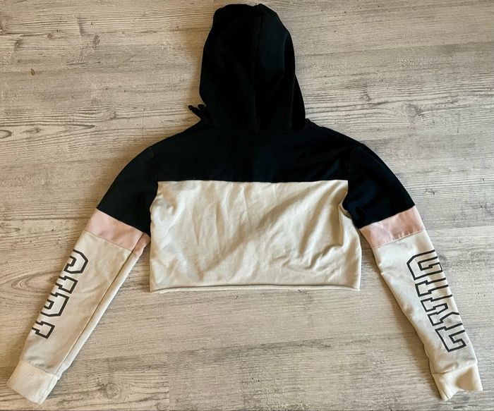 Sweat à capuche court Taille XS Largeur aux épaules 44cm, longueur 37cm Présence d’une petite tache sur la manche droite et de petites bouloches (voir photo) Occasion, état satisfaisant