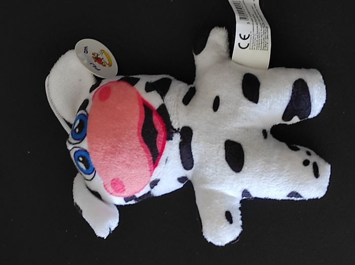 Peluche vache toute douce qui mesure environ 17 cm. Coloris : blanc, noir, rose et bleu. ✅ Très bon état : peu utilisée, aucune tache ni trou ✅ Taille idéale pour les petites mains ou pour décorer une chambre ✅ Lavée et rangée dans un placard, prête pour une nouvelle maison