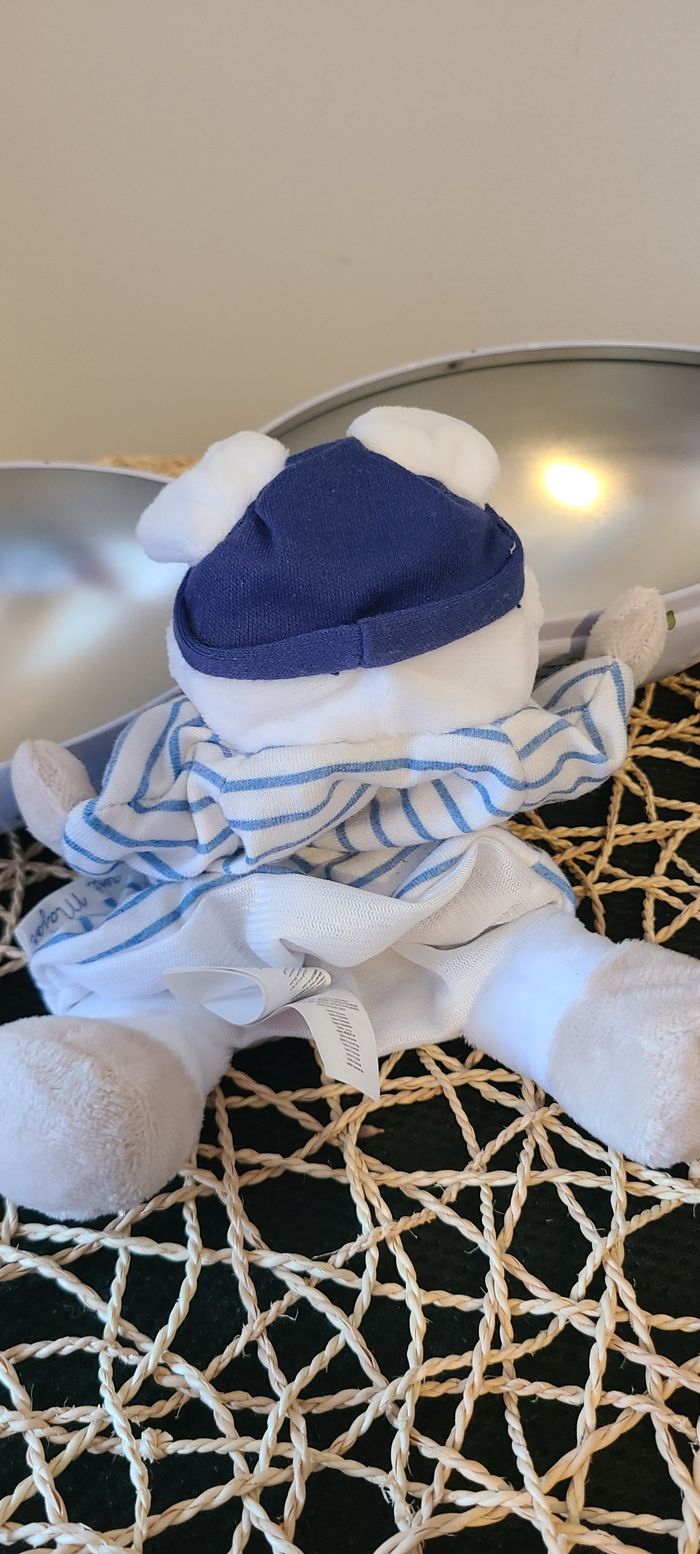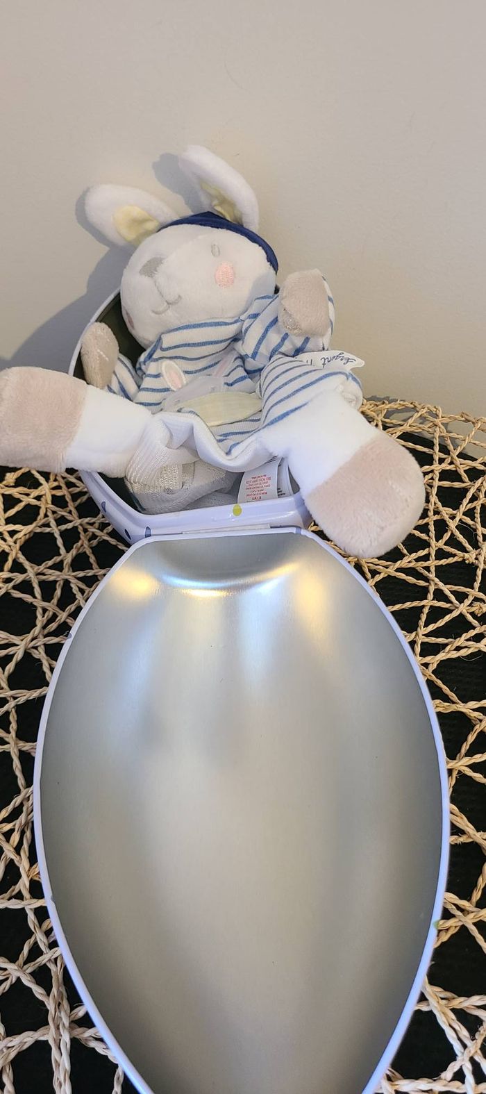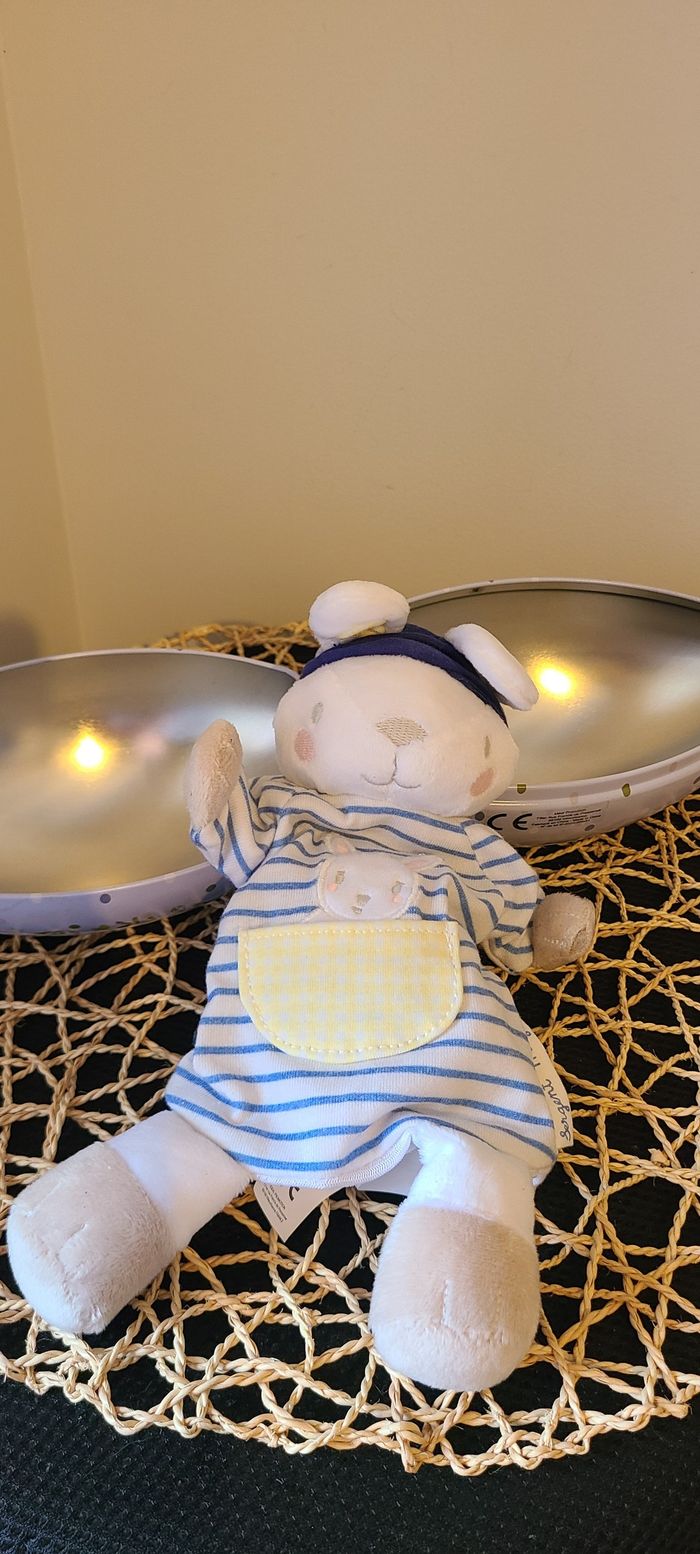 DOUDOU LAPIN PAQUES SERGENT MAJOR MARIONNETTE RAYURES BLEUES THEO JOUET OEUF METAL