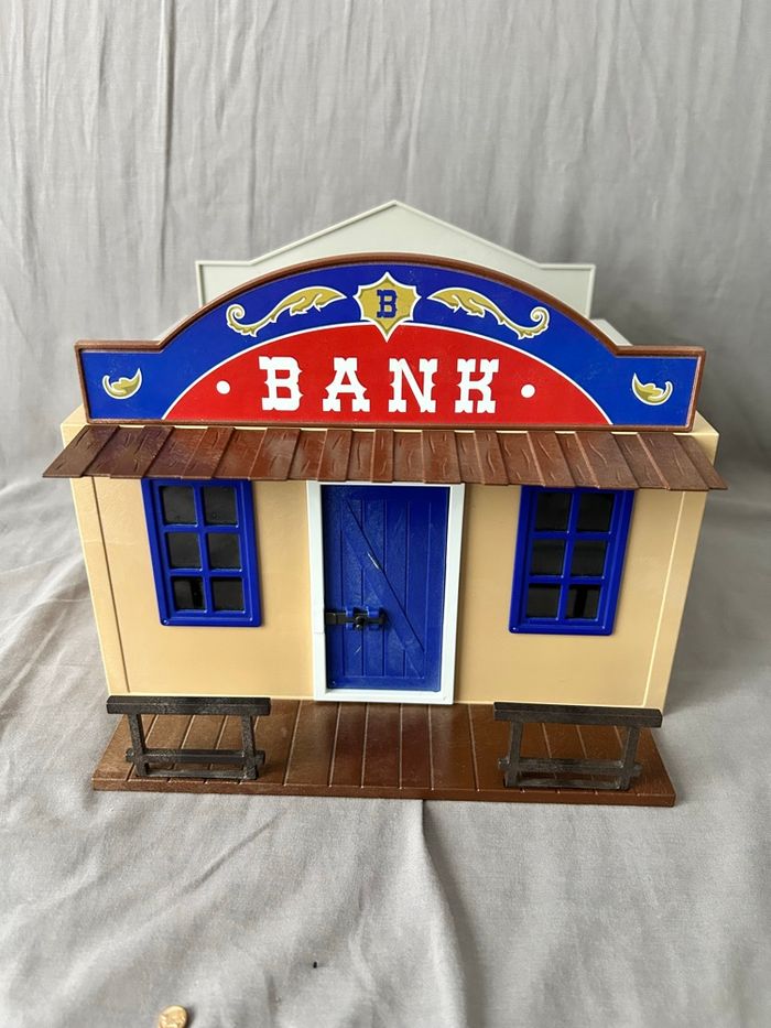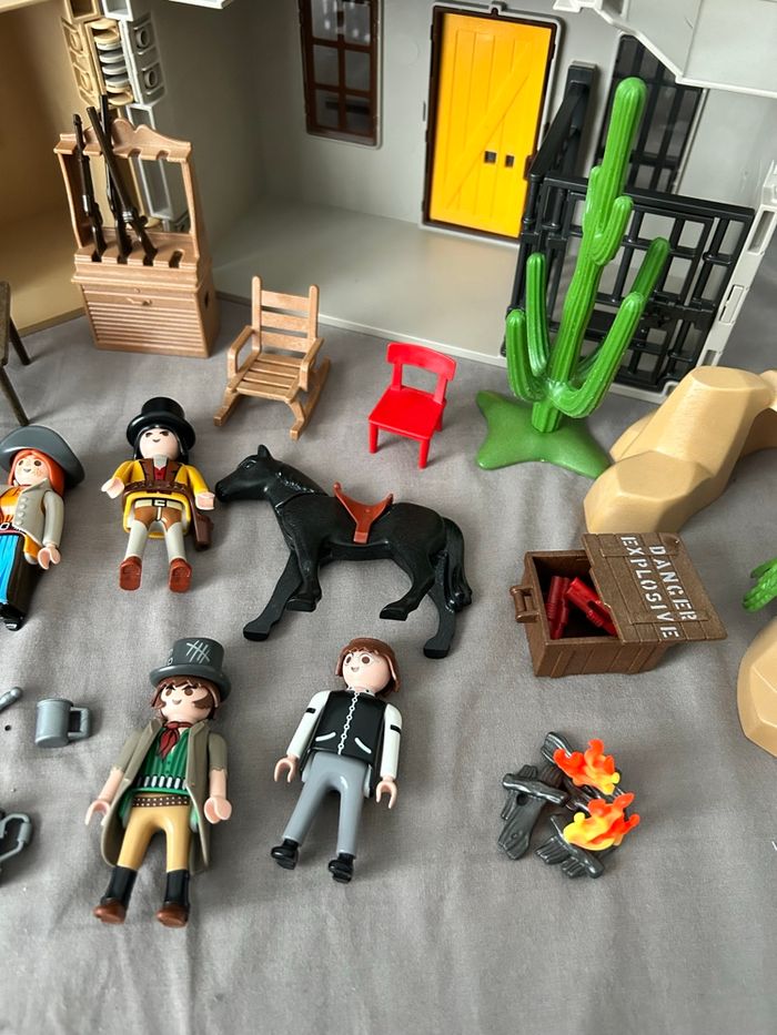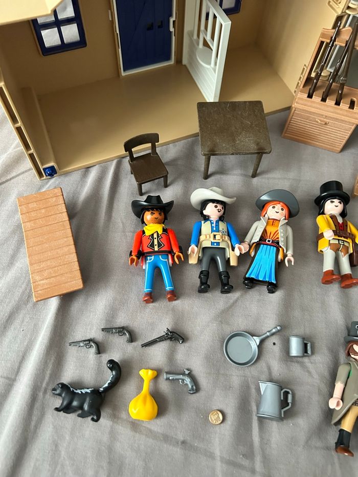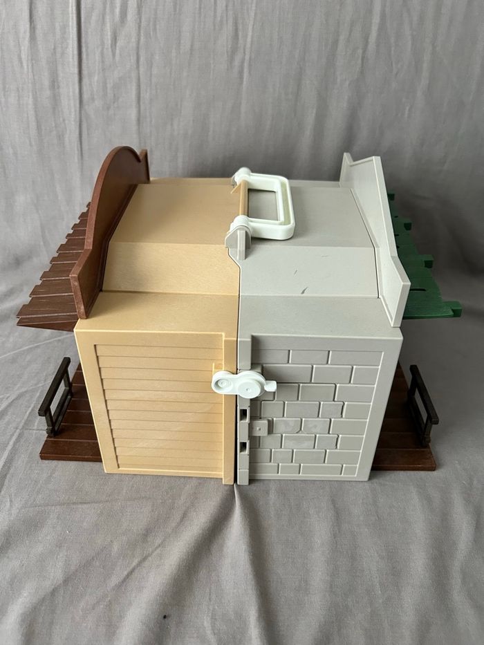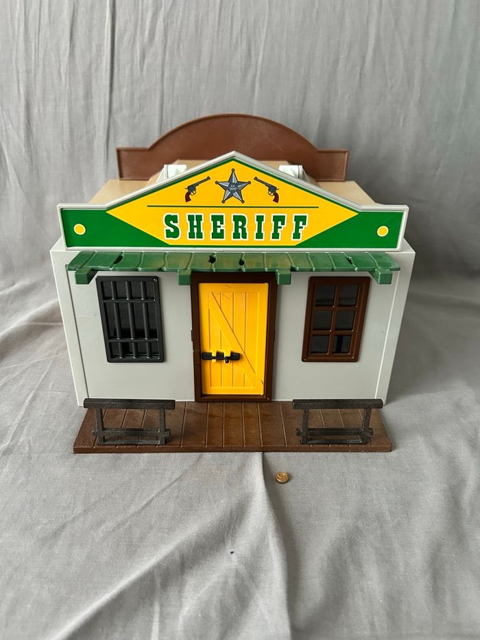 Lot Playmobil Far West / Western / Cow-boy Playmobil 4398 maison transportable shérif et banque Playmobil 5250 repaire des bandits Incomplets mais n’empêche pas le jeu, traces d’usure visible