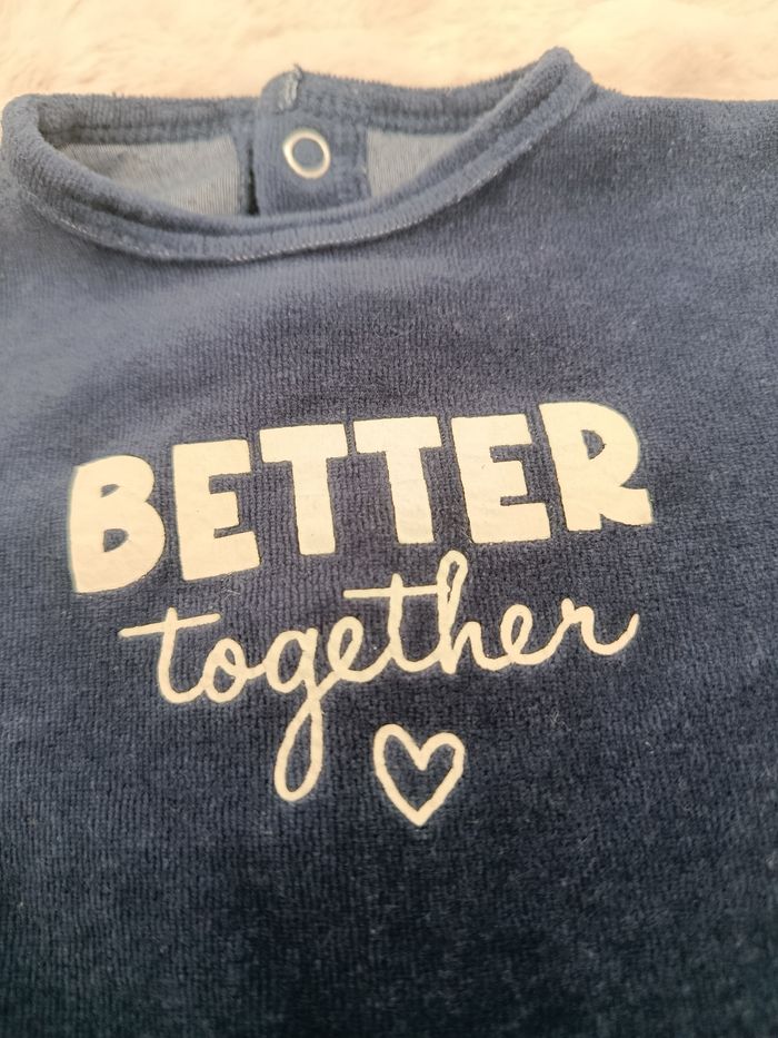 - Matière velours - Fermeture dans le dos avec pressions - Couleur bleu marine - Ecriture blanche " better together" non craquée - Aucune tâche ni trou