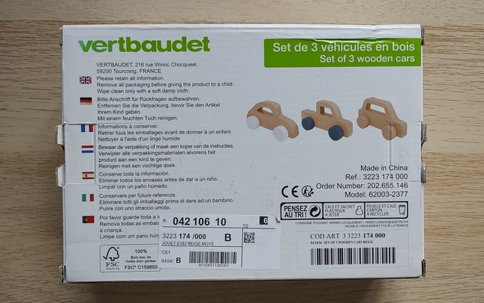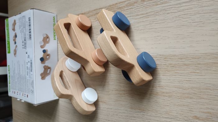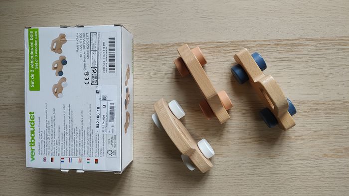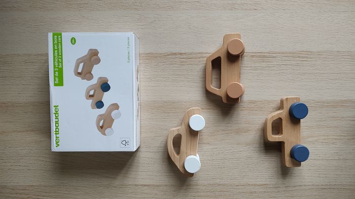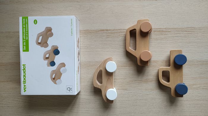 Set de 3 véhicules en bois Marque : Vertbaudet Très bon état, n'a quasiment jamais servi. Couleurs naturelles, bonne prise en main. Roues en bois, très bonne mobilité. Boîte présente en très bon état. Idéal cadeau 2nd mains pour Noël.