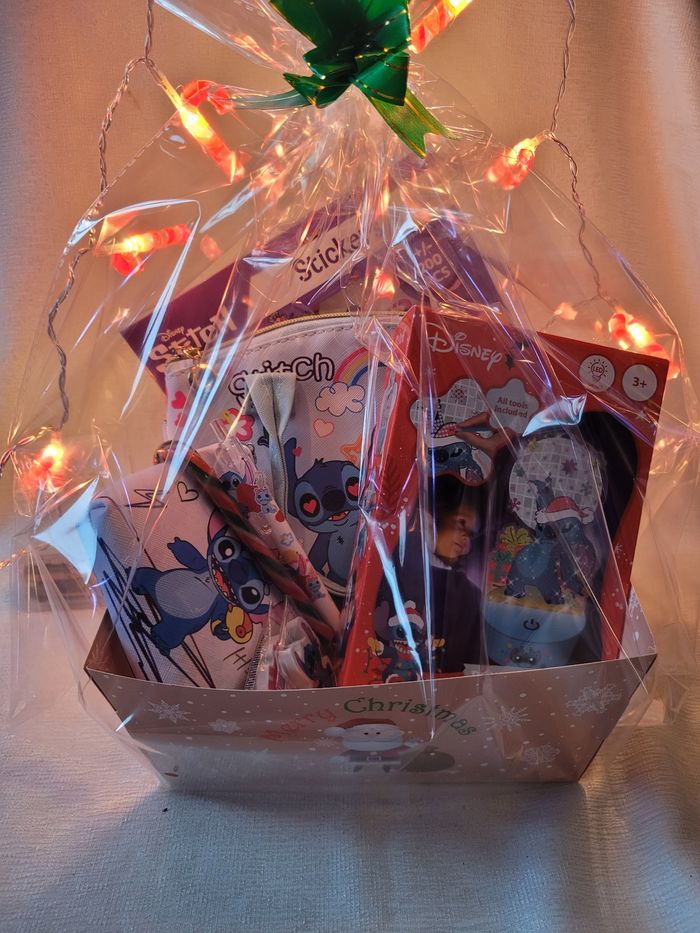 Panier de noel spécial stitch. Remise en main propre de préférence ( charmes, vosges ) . Si il faut envoyé, ce sera en " kit" , à faire vous même du coup. Le panier contient : 1 sac stitch 1 porte monnaie stitch 1 veilleuse à faire en diamant painting stitch 1 stylo stitch 2 gomme stitch Environs 200 autocollants Et de petite friandise
