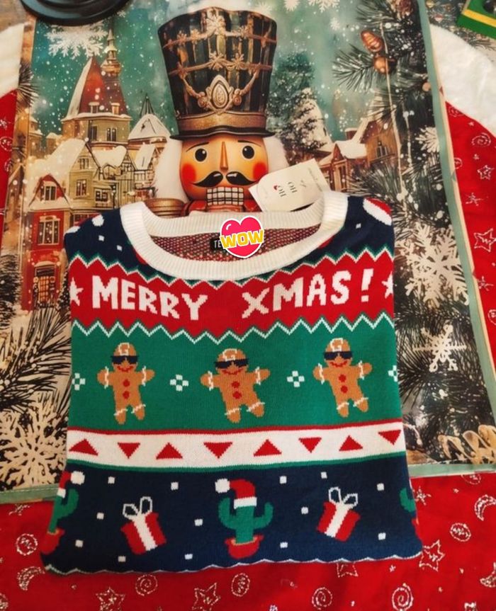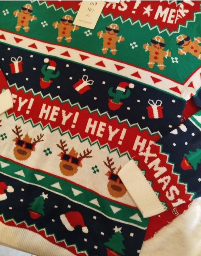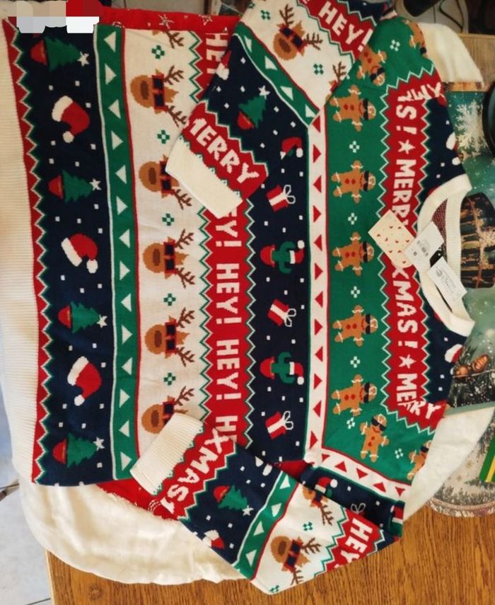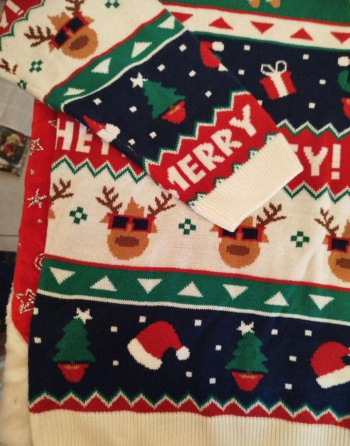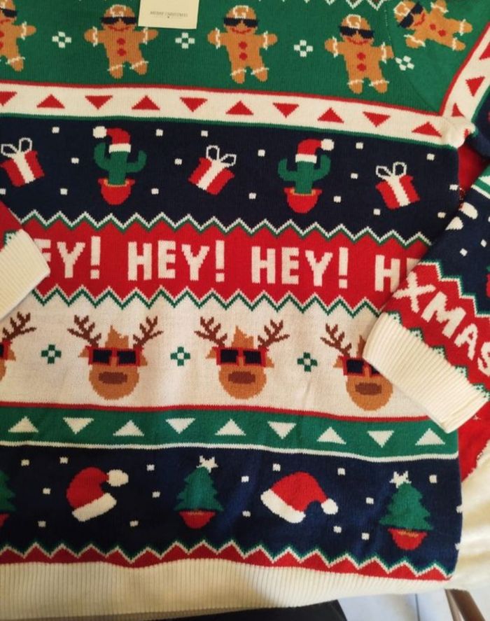 🎄 Pull de Noël S Neuf, encore plus frais qu’un sapin coupé ce matin 🎄 Tu veux briller aux repas de famille ? Faire sourire la mamie du voisin ? Ou juste assumer pleinement ton esprit de Noël ? J’ai LE pull qu’il te faut. 🧁 Motifs gingerbread (les petits bonhommes qui ont l’air trop gentils pour être mangés) 🌵 Un cactus festif (oui, même lui n’a pas échappé à la magie de Noël) 🎁 Des cadeaux partout (malheureusement, ils sont imprimés, tu peux pas les ouvrir) 🦌 Des rennes motivés (prêts à t’accompagner jusqu’à la fin de l’hiver) ✨ “Merry Xmas” bien visible pour éviter de devoir souhaiter de joyeuses fêtes aux gens toi-même Le tout dans les couleurs officielles de Noël : rouge, vert, blanc… bref, l’esprit de fête concentré en un seul vêtement. Taille S neuf de chez neuf (il n’a même pas encore entendu une blague nulle de tonton Gérard). Prêt à rendre n’importe quelle soirée plus fun ! 🎅