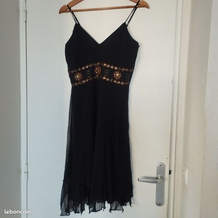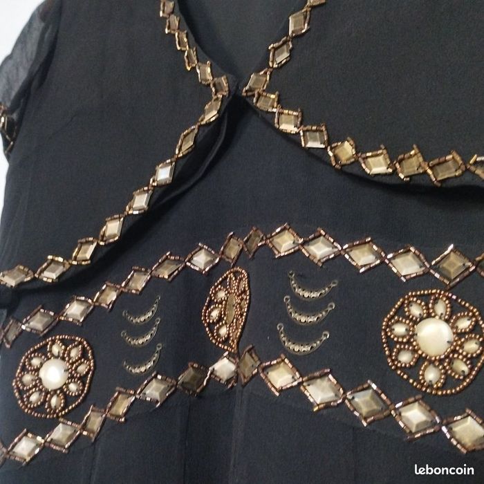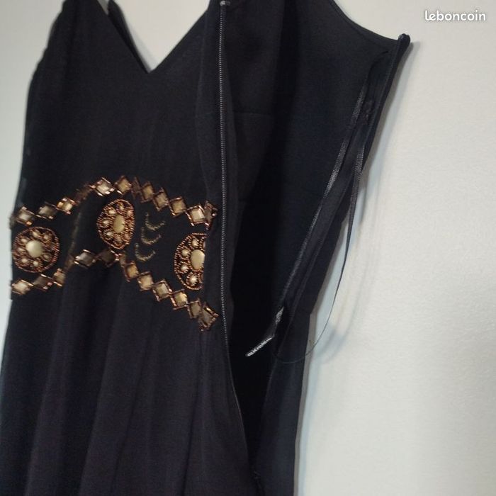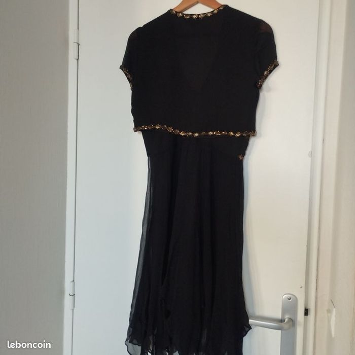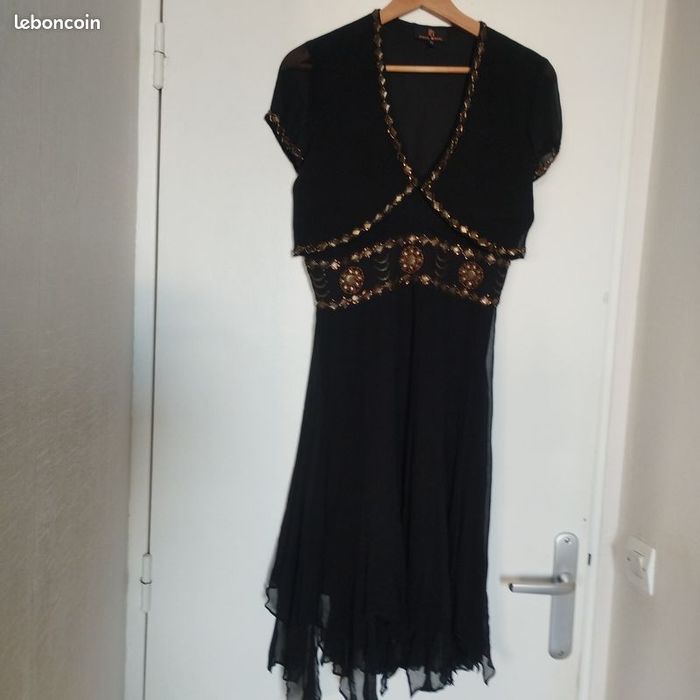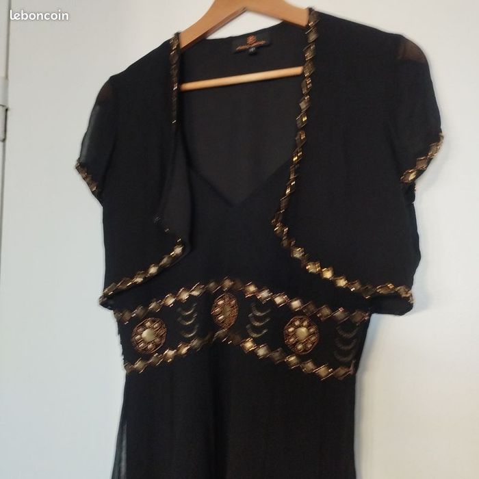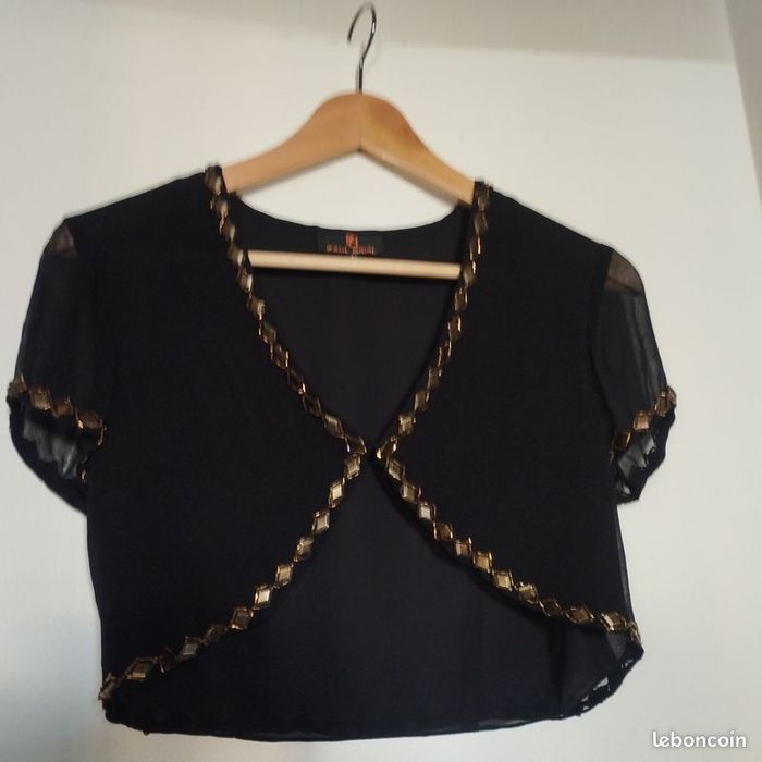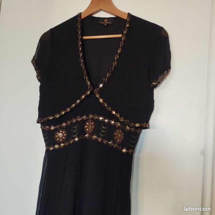 Robe et Boléro pour soirée, cérémonie de Paul Brial, 100% Soie, doublée, robe noire avec perles et pierres métal cousues, robe à fines bretelles réglables, portée une fois pour une occasion ! elle est comme neuve. Taille 1