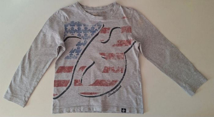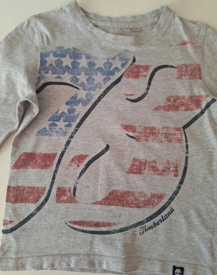 Grand imprimé devant légèrement effacé, petit écusson cousu à la base. Auréole à l'épaule gauche. Coton 100 %.