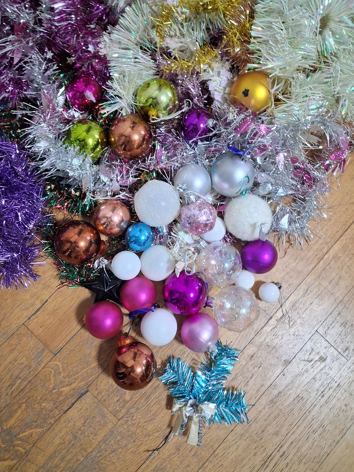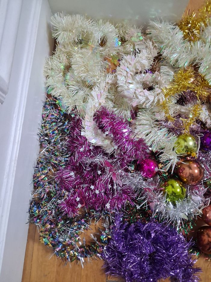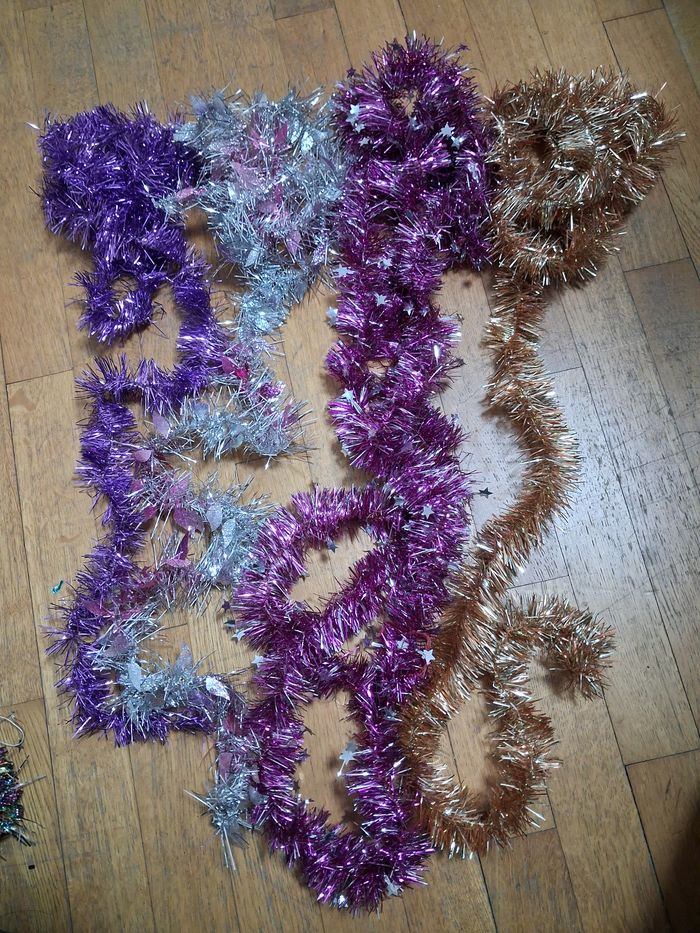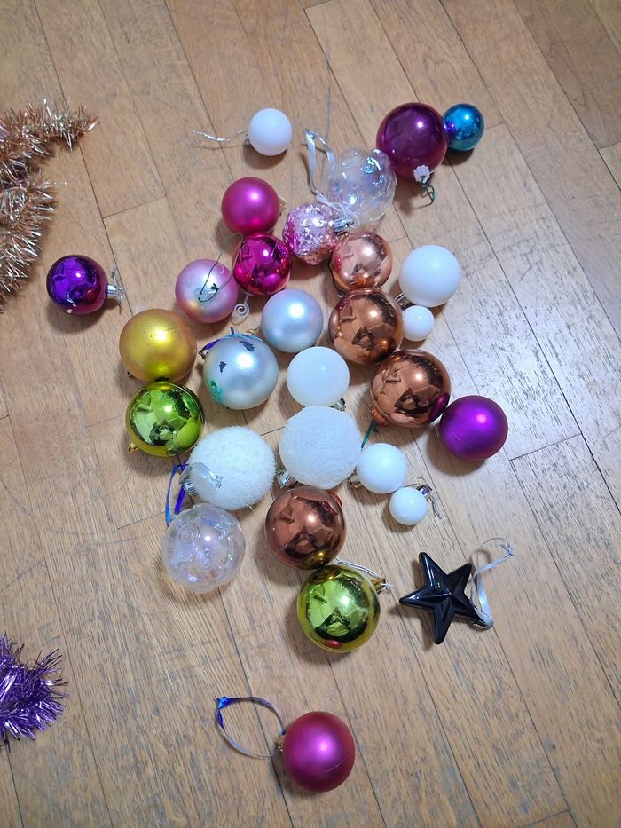 Lot de déco pour Noël 29 boules de différentes couleurs et taille 1 sujet 12 guirlandes de différentes formes et couleur Très bon état