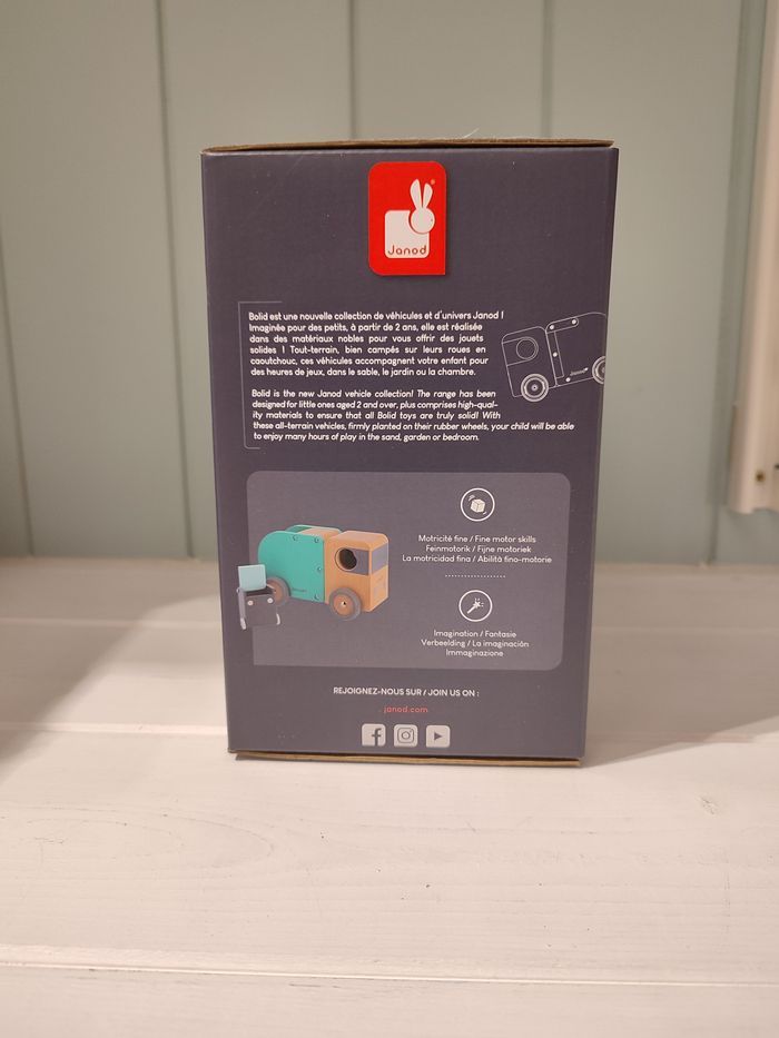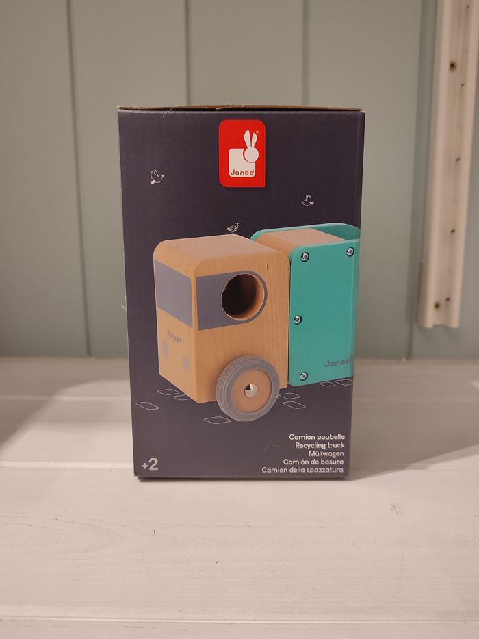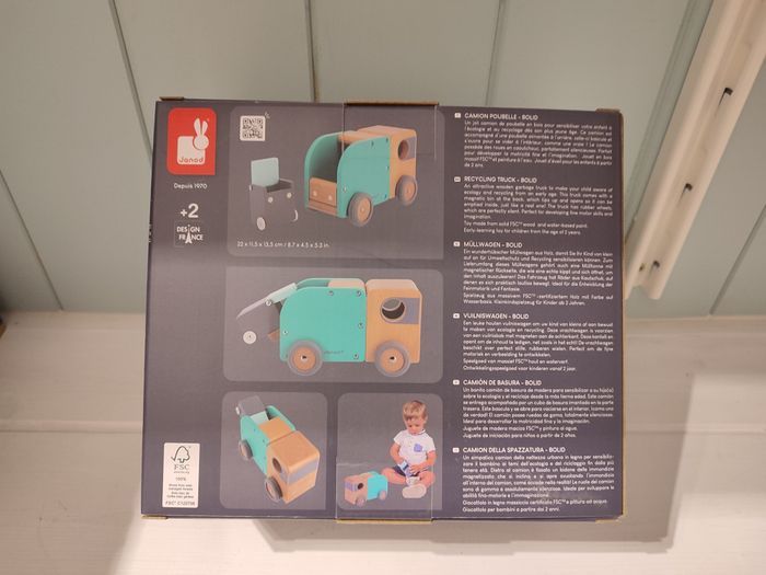 produit neuf Janod Ce beau camion poubelle en bois massif aidera à sensibiliser votre enfant à l'écologie et au recyclage. Pour plus de réalisme, ce camion vert, gris et bois, est accompagné d'une poubelle aimantée qui bascule pour se vider à l'arrière du camion ! Votre tout-petit, dès 2 ans, pourra ainsi inventer ses propres histoires tout en développant sa motricité fine. Ses dimensions de 21,8 cm de long et de 11,8 cm de haut et ses roues silencieuses en caoutchouc en font un jouet adapté aux petites mains. Ce jouet est fabriqué en bois certifié FSC® et peint à l'eau.