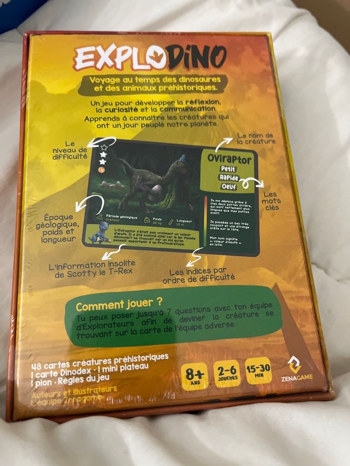 Jeu explodino Explodino est un jeu de société pour les enfants à partir de 8 ans qui permet de découvrir le monde des dinosaures ! Un jeu pour 2 à 6 joueurs qui ou il faut poser les bonnes questions pour gagner et qui développe la réflexion et permet d'enrichir ses connaissances. Posez jusqu'à 7 questions afin de trouver la carte de votre adversaire. Voyagez au temps des dinosaures et des animaux préhistoriques !