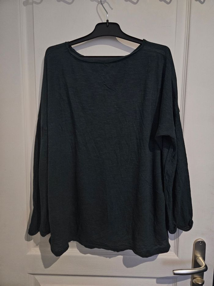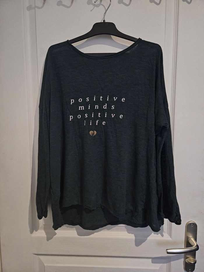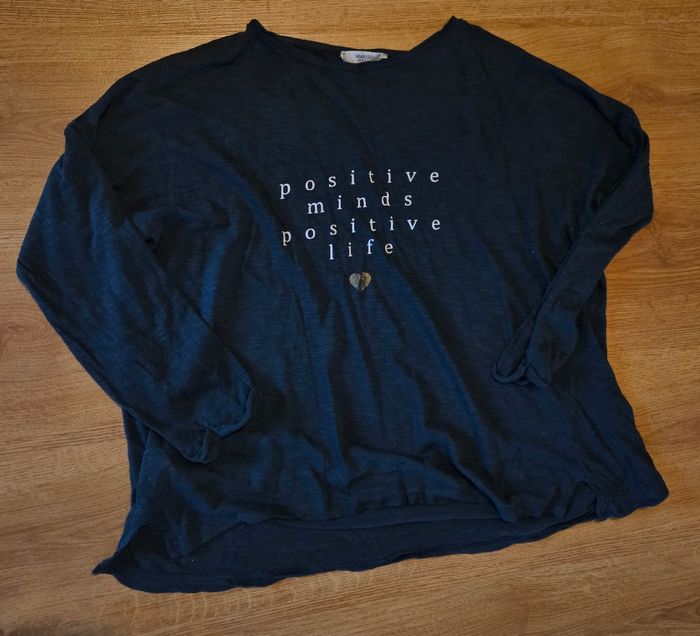 Top Mango femme en taille S (36/38), couleur vert foncé. Manches 3/4, coupe confortable et message imprimé “positive minds positive life”.