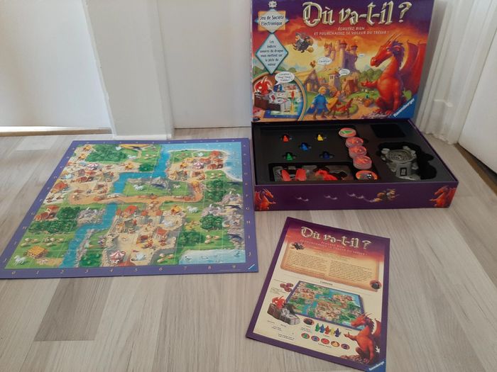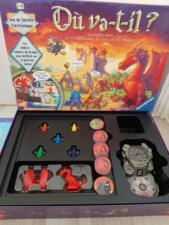 #Jeux_de_Société_Nathg2210 JEU DE SOCIÉTÉ : OU VA-T'IL ? "RAVENSBURGER" - Age 6 / 99 ans - n°21 Jeu de société électronique - Les indices sonore du dragon vous mettent sur la piste du voleur - Écoutez bien et pourchassez le voleur du trésor ! Article d’occasion en très bon état - Désinfecté pour la vente - Livré avec notice et boite d'origine - Piles non fournies. Possibilité d'envoyer d'autres photos sur simple demande. Maison non-fumeur - Sans animaux. Réduction lot activée. Allez voir mes autres ventes, je vide les placards. Beaucoup de vêtements de marque et beaucoup de jouets. Remise en mains propres ou possibilité d'envoi au tarif en vigueur à votre charge. Retour Refusé. Pour tout renseignement, n'hésitez pas à me contacter, je répondrai volontiers à vos questions. Réponse Assurée. Pour Consulter mes autres annonces tapez Nathg2210.