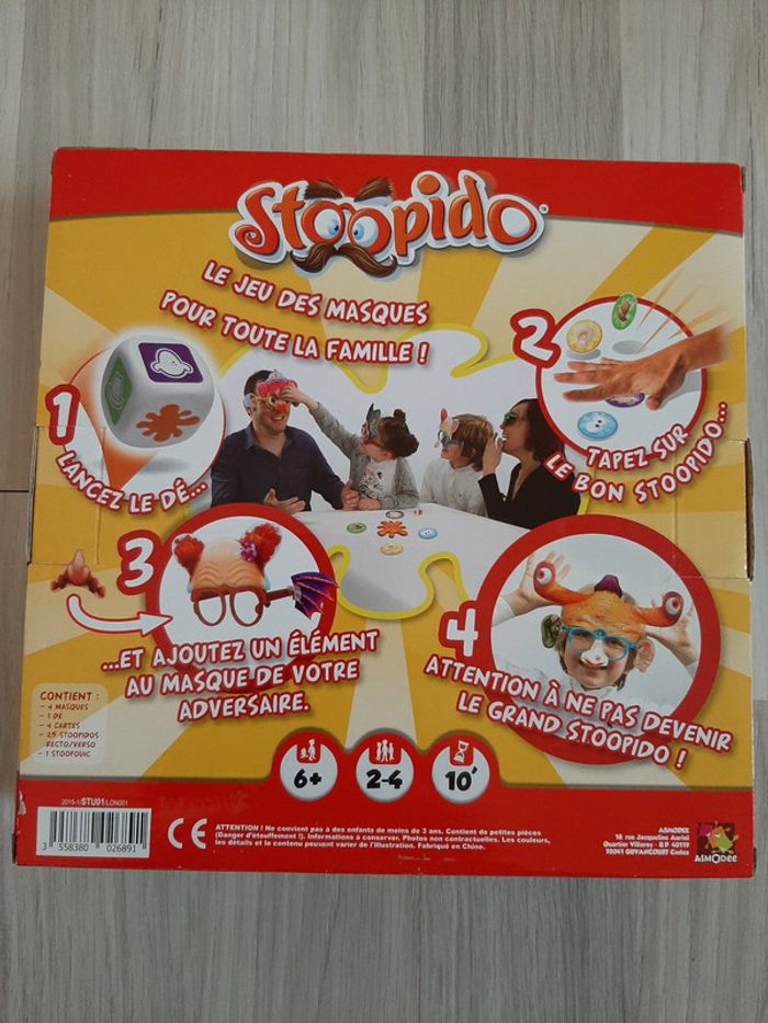 #Jeux_de_Société_Nathg2210 JEU DE SOCIÉTÉ : STOOPIDO "ASMODEE" - NEUF - Age 6+ - n°27 Jeu de société : Le jeu des masques pour toute la famille - A vos masques... prêts ? Jouez ! Article neuf - Dans son emballage d'origine - Juste le blister retiré - Jamais servi. Possibilité d'envoyer d'autres photos sur simple demande. Maison non-fumeur - Sans animaux. Réduction lot activée. Allez voir mes autres ventes, je vide les placards. Beaucoup de vêtements de marque et beaucoup de jouets. Remise en mains propres ou possibilité d'envoi au tarif en vigueur à votre charge. Retour Refusé. Pour tout renseignement, n'hésitez pas à me contacter, je répondrai volontiers à vos questions. Réponse Assurée. Pour Consulter mes autres annonces tapez Nathg2210.