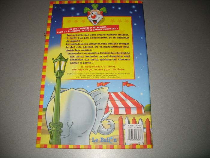 #Jeux_de_Société_Nathg2210 JEU DE SOCIÉTÉ : LE CIRQUE EN FOLIE "LE BALLON" - n°37 Un jeu d'observation et de rapidité pour 2 à 4 jours - Composé de 20 pions et 32 cartes - Une règle du jeu et une piste - Sous forme de livre. Article d’occasion en très bon état – Nettoyé et désinfecté pour la vente. Possibilité d'envoyer d'autres photos sur simple demande. Maison non-fumeur - Sans animaux. Réduction lot activée. Allez voir mes autres ventes, je vide les placards. Beaucoup de vêtements de marque et beaucoup de jouets. Remise en mains propres ou possibilité d'envoi au tarif en vigueur à votre charge. Retour Refusé. Pour tout renseignement, n'hésitez pas à me contacter, je répondrai volontiers à vos questions. Réponse Assurée. Pour Consulter mes autres annonces tapez Nathg2210.