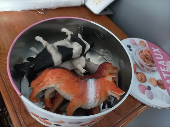 Lot tracteur avec remorque et 9 animaux rangés dans une boîte en métal