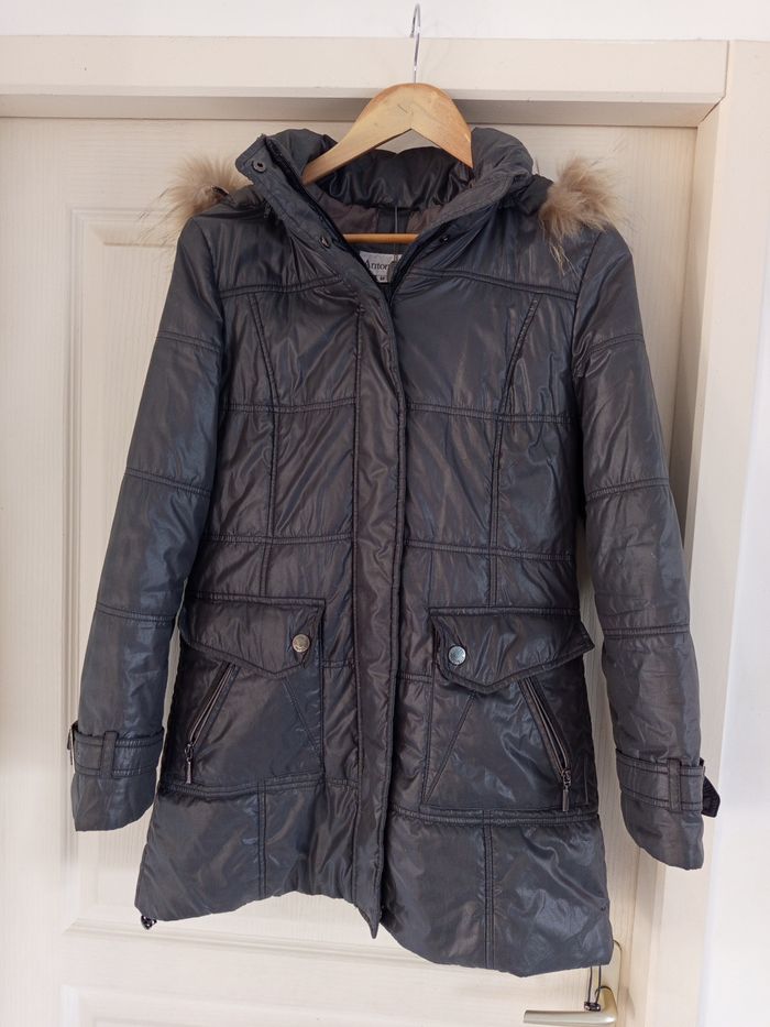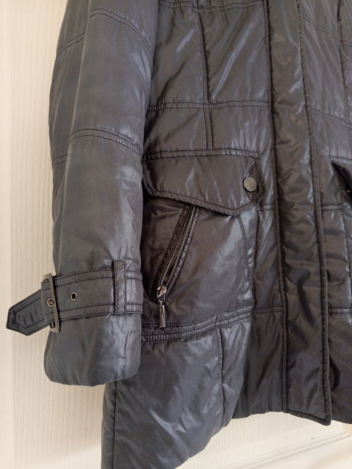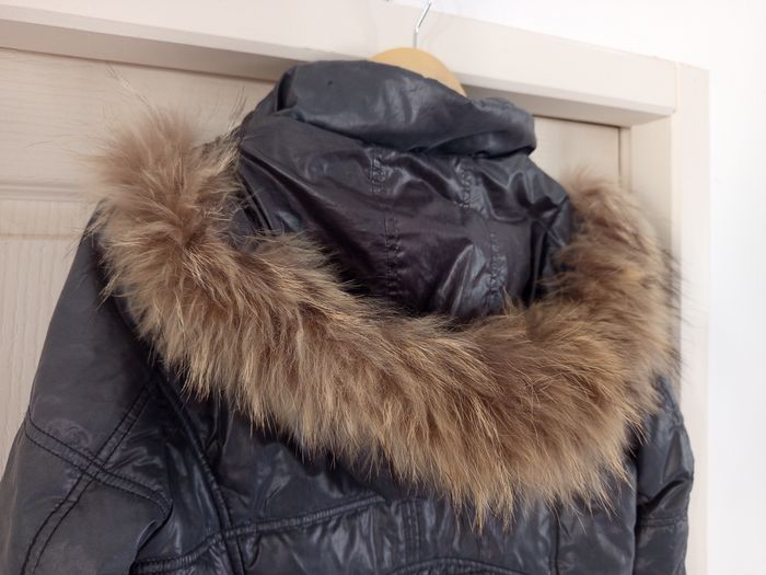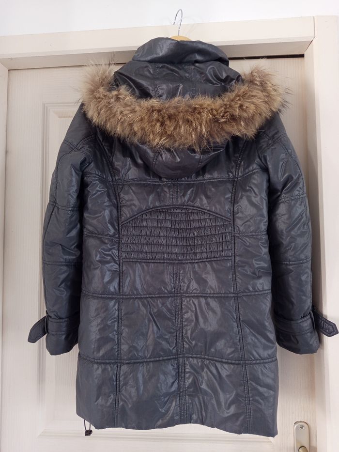 Manteau type doudoune longue, avec capuche (fausse fourrure) amovible (grâce à un zip - voir photo), gris foncé