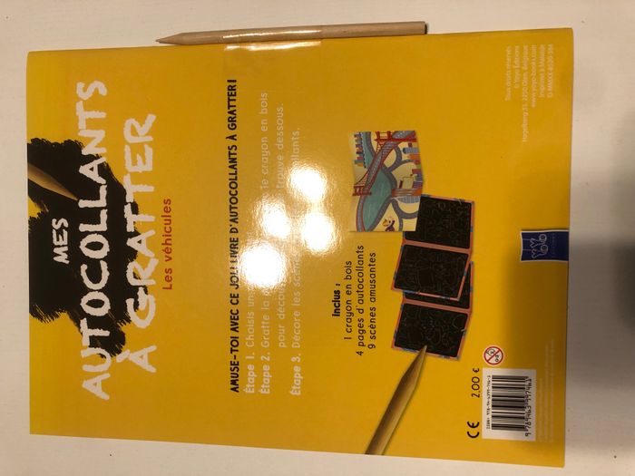 Cahier d'activités avec autocollants à gratter (90 autocollants repositionnables) Thème Les véhicules Choisis un autocollant, gratte la pellicule noire avec le crayon en bois pour découvrir l'image qui se trouve dessous et décore les scènes avec les autocollants.