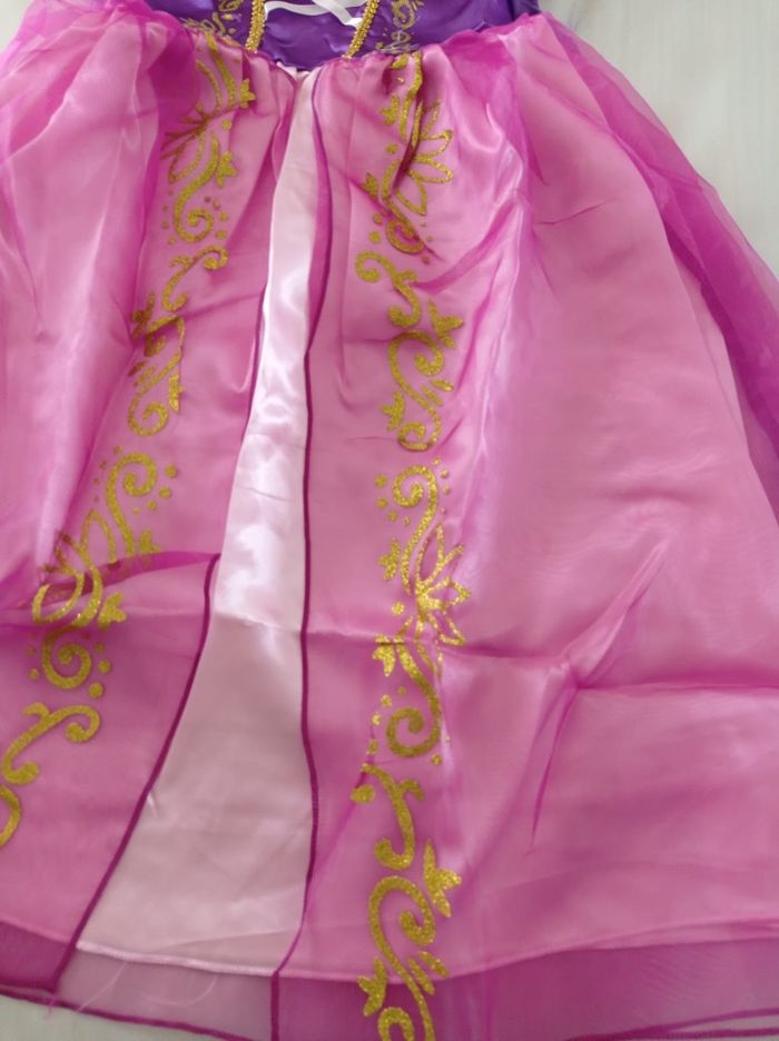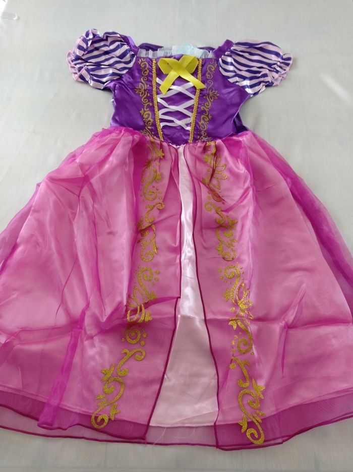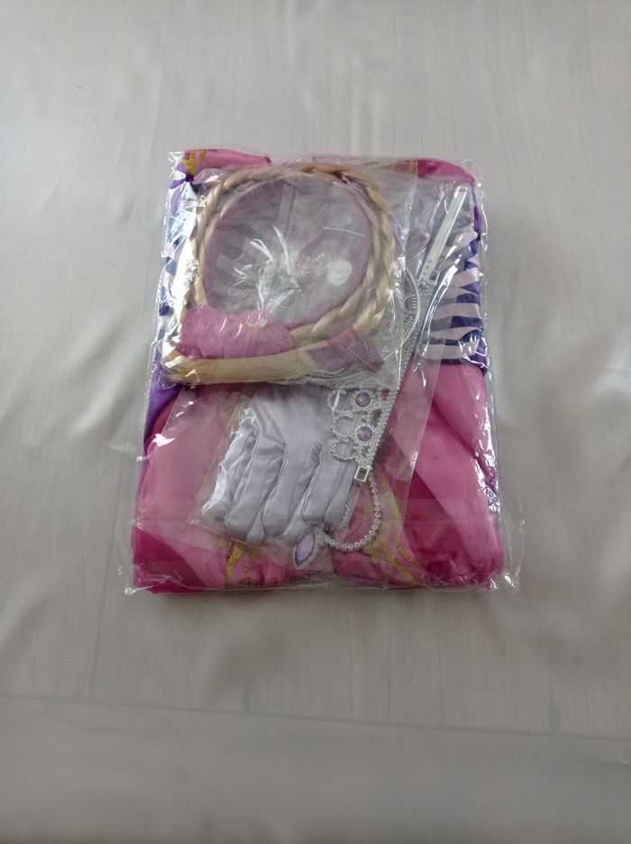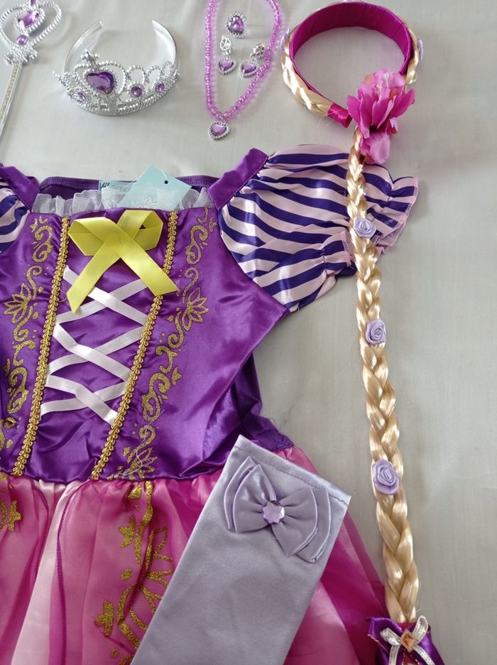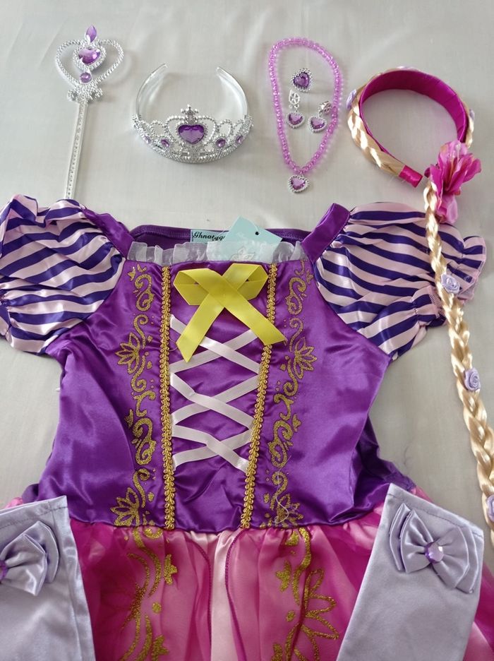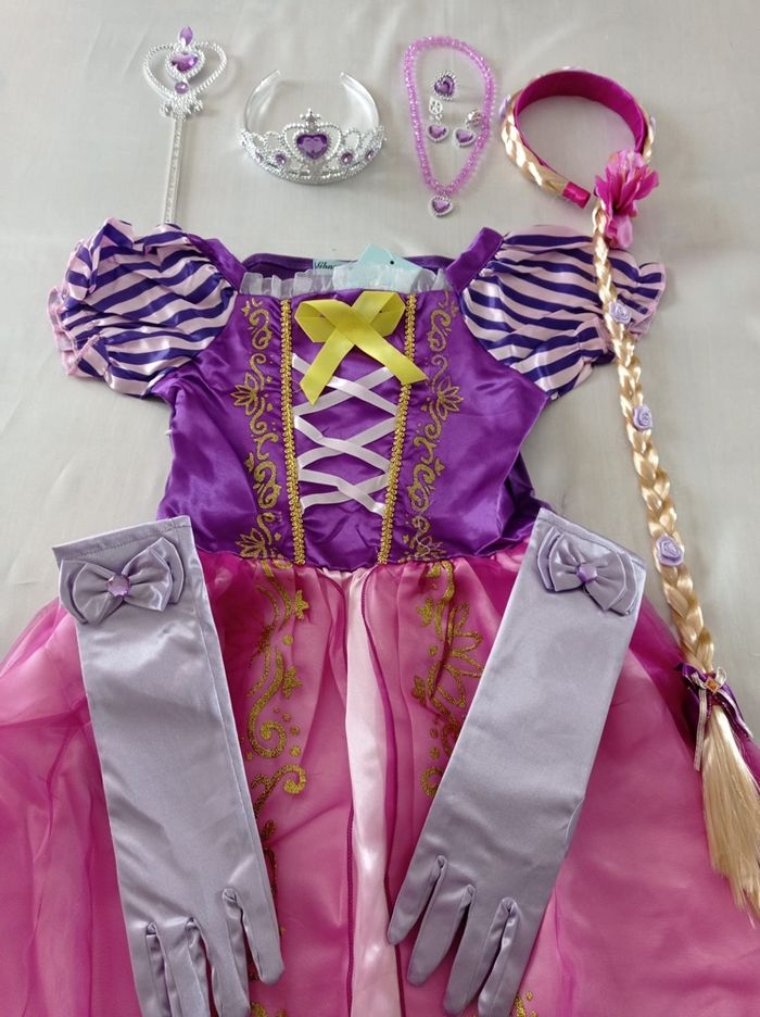 Déguisement robe princesse raiponce et ces accessoires (couronne, baguette, gants, bijoux, tresse). La robe mesure 80cm de longueur, la taille convient aux petites filles de 5-6ans. Totalement neuve, vendue dans son emballage d’origine. Expédition rapide après votre commande.