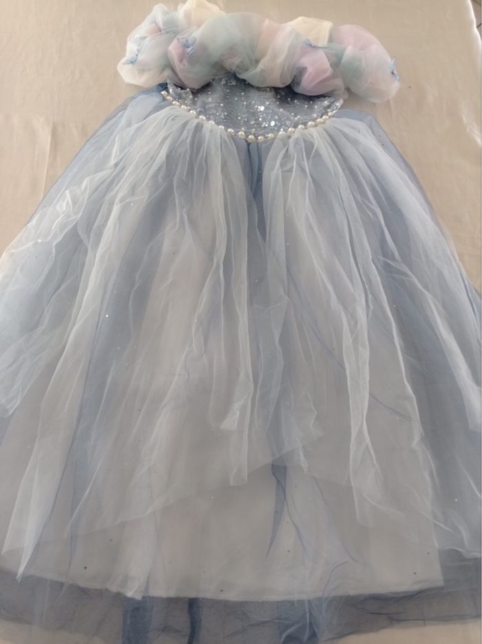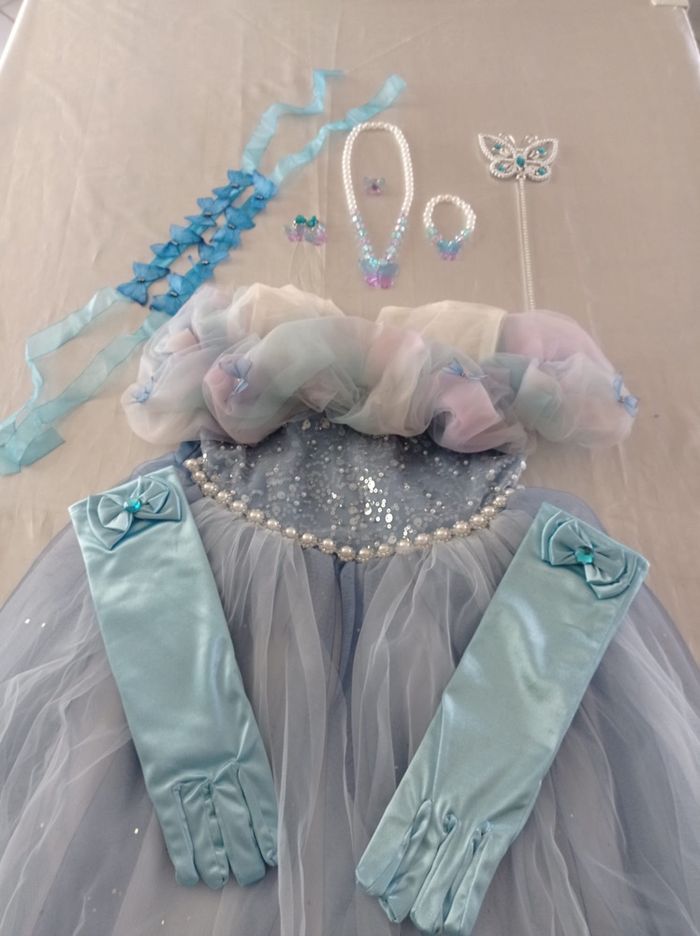 Déguisement robe princesse bleu perle et ces accessoires (gant, baguette, bijoux). La robe mesure 85cm de longueur, la taille convient aux petites filles de 5-6ans. Totalement neuve, vendue dans son emballage d’origine. Expédition rapide après votre commande