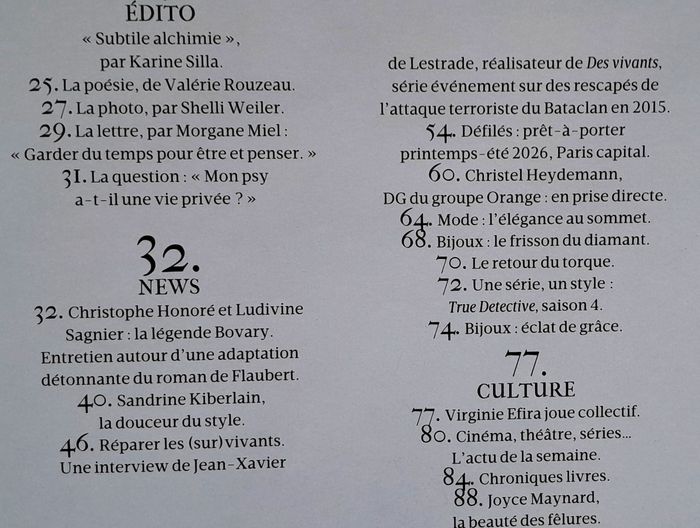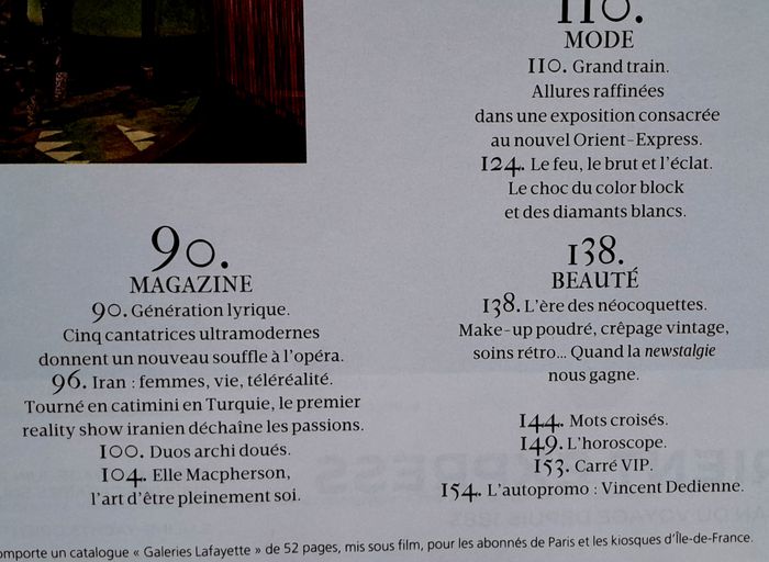 154 pages supplément numéros 25250 et 25251 27x21cm spécial Christophe Honoré et Ludivine Sagnier 4 pages, Sandrine Kiberlain 2 pages, Virginie Efira 2 pages, cantatrices d'opéra 6 pages, Iran femmes téléréalité, duos archi doués, Elle 6 pages, mode grand train, mode le feu le brut et l'éclat, l'ère des néo ..