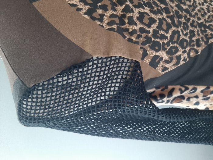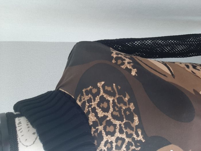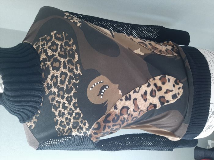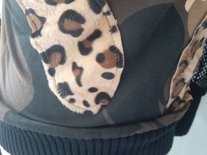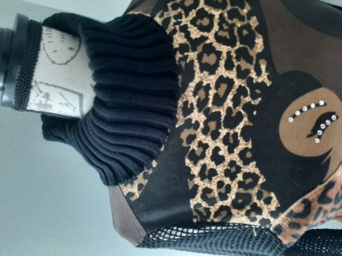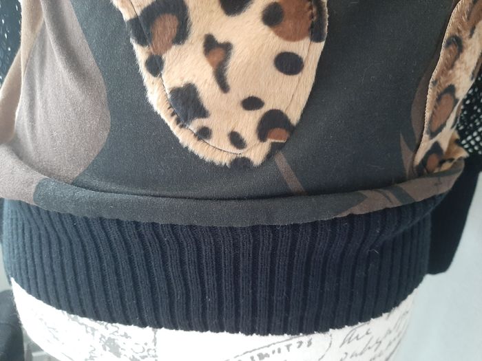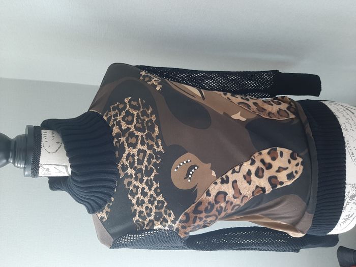 en parfait etat est noté L XL sur l'étiquettes mais correspond à un 38 40 sur le devant du pull avec le visage il y a 2 morceaux de tissu leopard en velours voir photos modele tres original