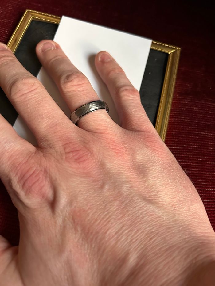 1. Finition Tendance : L'anneau est orné d'un magnifique effet martelé (hammered finish) qui capte la lumière.