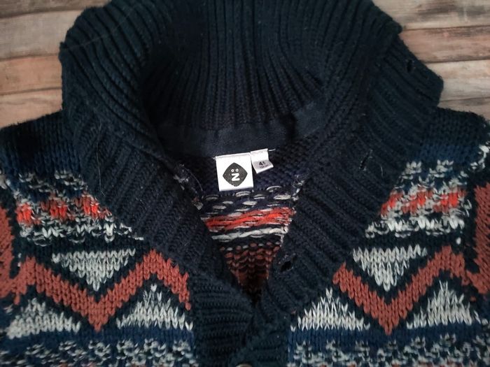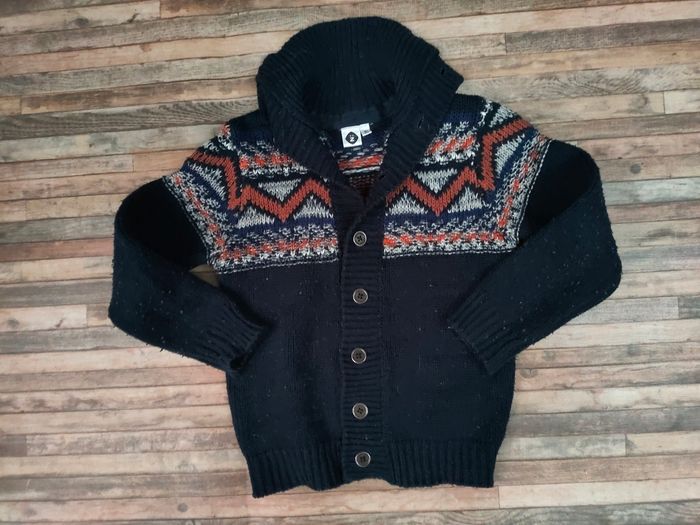 👉Gilet en maille chaud marque Z, porté, qq bouloches. Coloris bleu marine. Joli motif jacquard, hivernal.