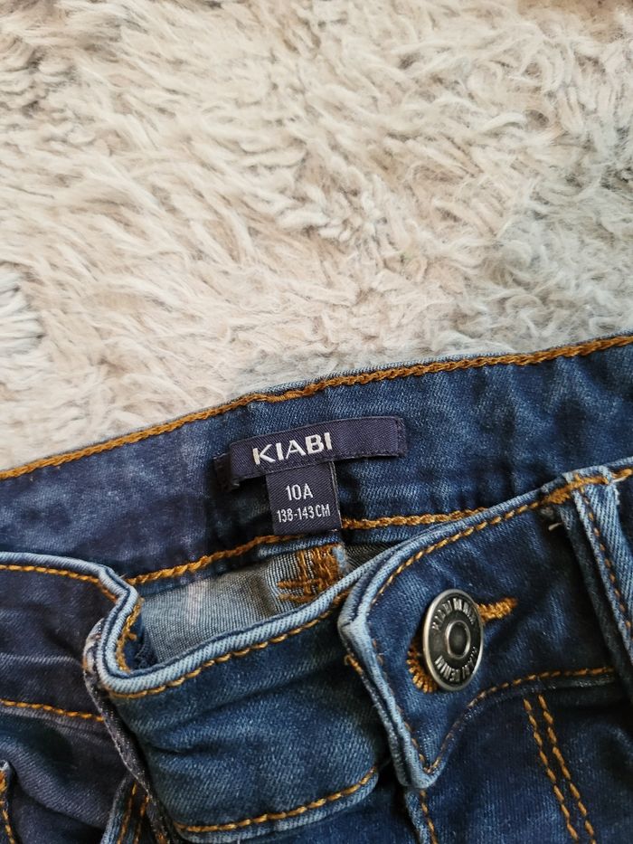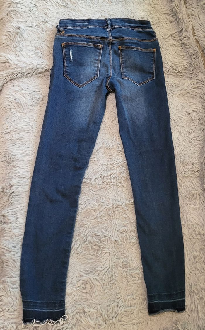 Très bon état ce jeans marine avec jolies details dessus et pieds effilochés. Confort car taille ajustable par boutons élastique.
