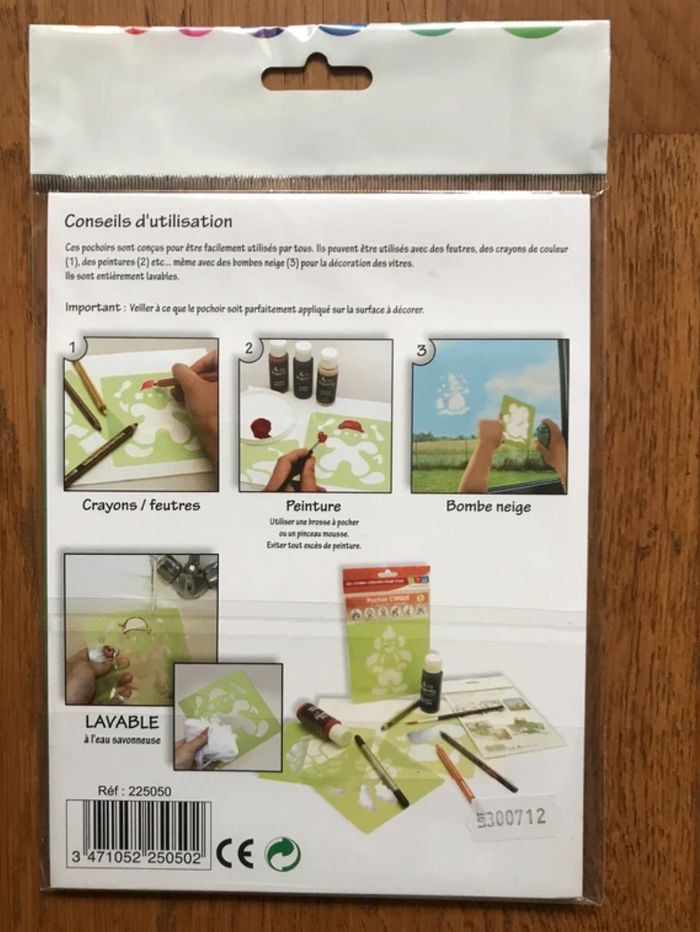 - Bien évacuer l'excédent de peinture de la brosse à pocher, puis effectuer des mouvements circulaires dans le pochoir. - Ne pas tamponner, ce qui aurait pour effet de faire baver la peinture sous les bords du pochoir.