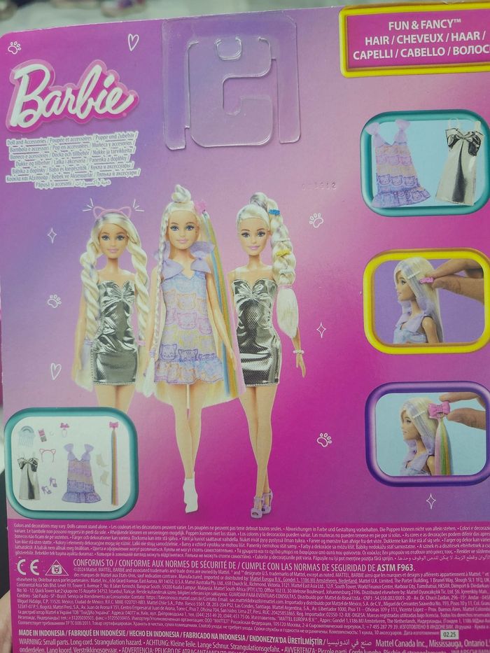 Neuf , N’hesitez pas a faire des lots. Barbie Poupée Fun & Fancy, poupée blonde avec cheveux extra-longs, 2 tenues, dont une robe argentée métallisée, avec accessoires, une extension de cheveux,