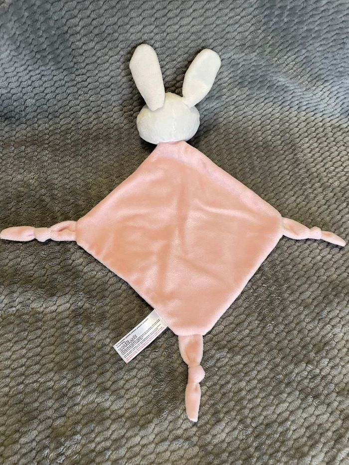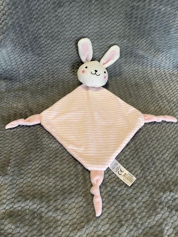 Doudou plat Lapin rose blanc rayé grelot Tom & Kiddy