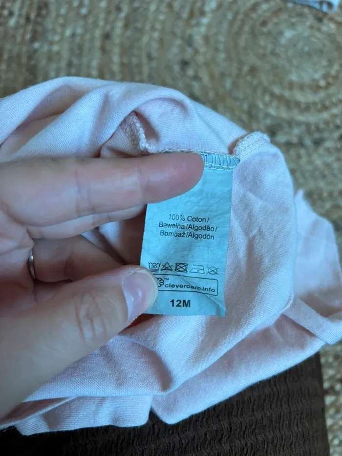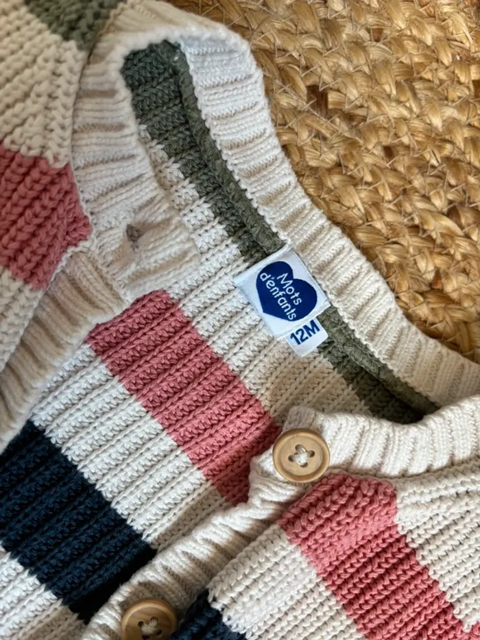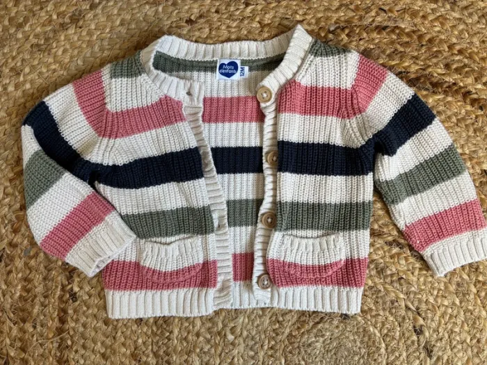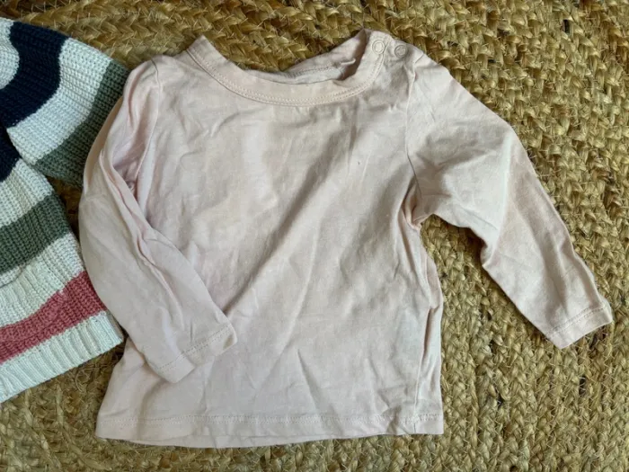 Gilet rayé + t-shirt ml rose Le tout est en parfait état, marque mots d’enfants en taille 12 mois