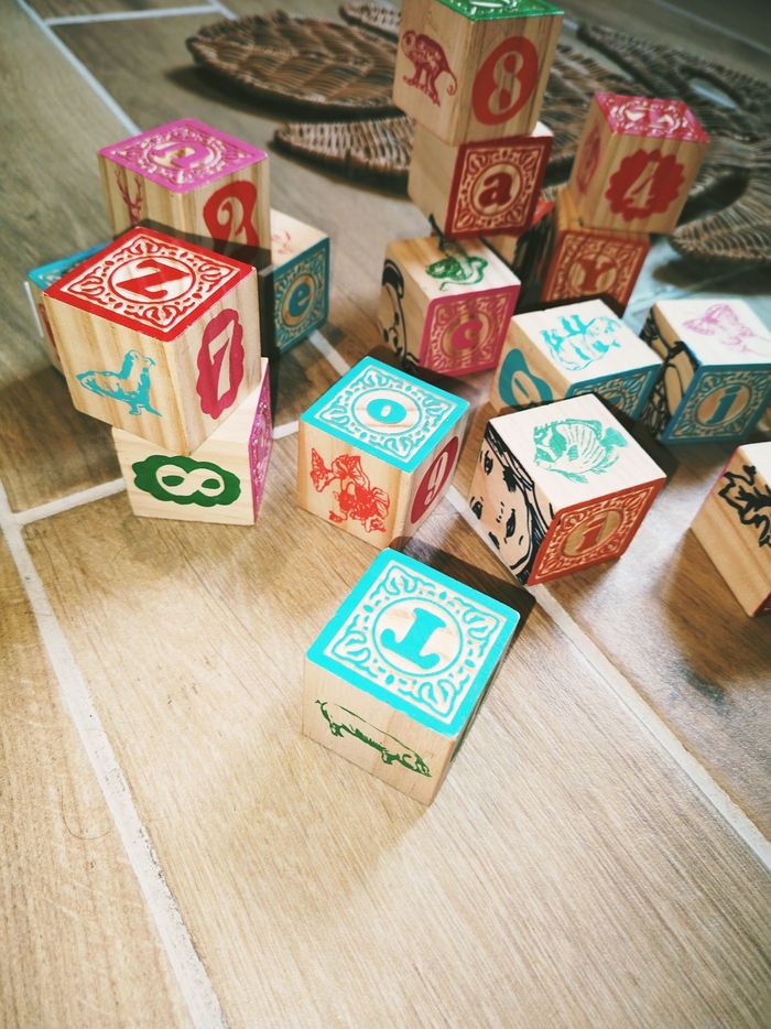 🎀 Divers cubes avec dessins, chiffres... afin de développer l'imagination et la créativité de l'enfant
