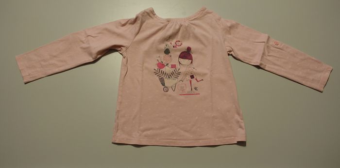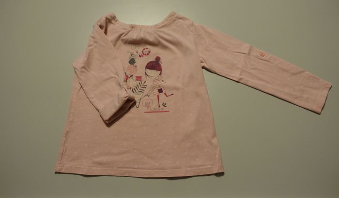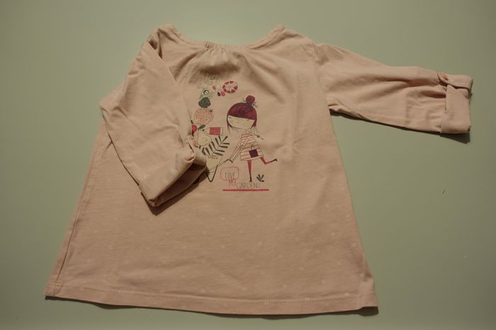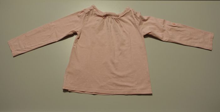 Vends joli t-shirt pour fille de 6 ans, en bon état. 🌸Col rond 🌸Manches longues pouvant être retroussées 🌸Motif et imprimé à pois sur le devant