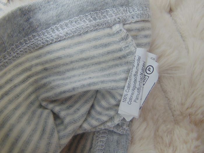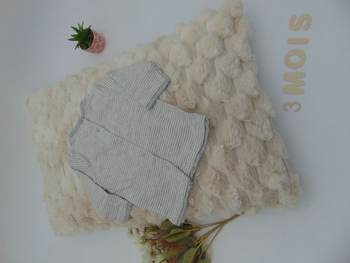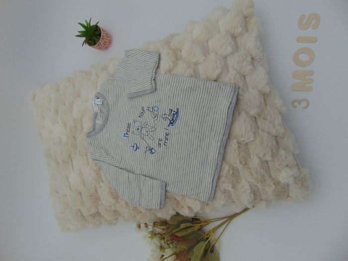 - Manches longues - Fermeture avec pressions dans le dos - Couleur gris et blanc à rayures - Dessin ourson et jouets bleus - Aucune tâche ni trou