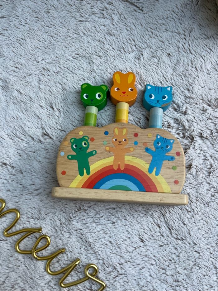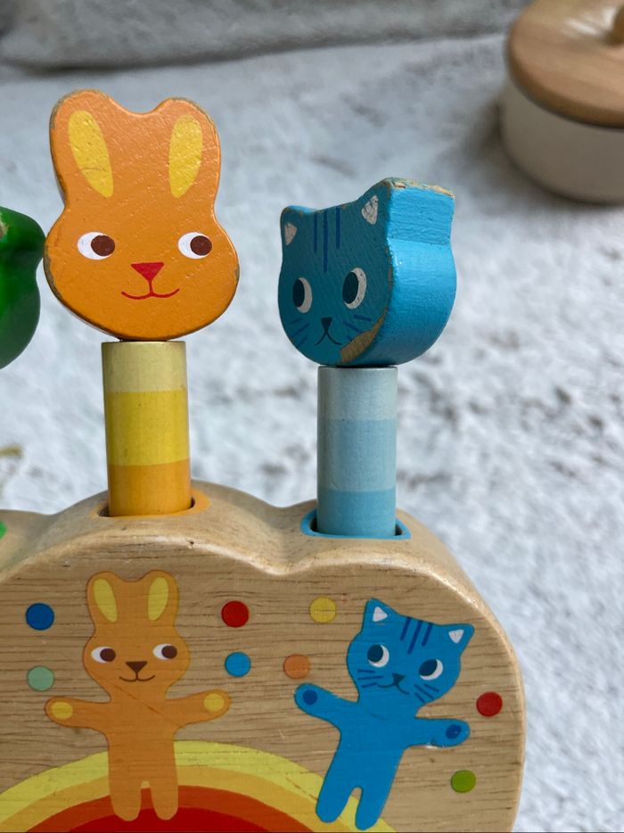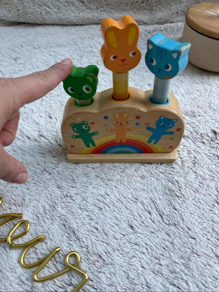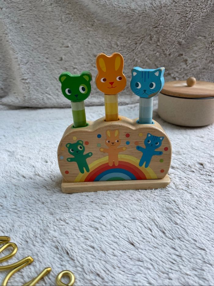 Pipop Pidop - Jeu pop up en bois Très bonne état juste quelque éclat de peinture sur le pop bleu (voir photo) À partir de 12 mois Djeco