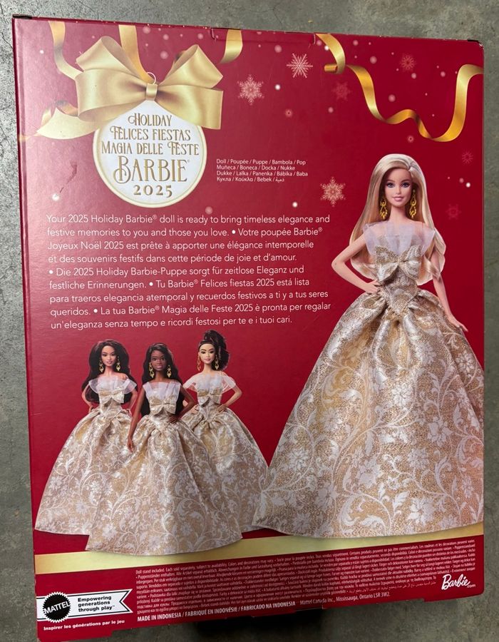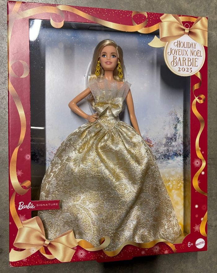 Neuf, Découvrez la poupée Barbie Joyeux Noël 2025, une somptueuse poupée de collection conçue pour capturer l'élégance des fêtes. Elle mesure 34 cm de hauteur, 8 cm de largeur et 27 cm de longueur, réalisée avec des matériaux de haute qualité. La poupée arbore une robe bustier sans bretelles ornée de tulle avec une jupe volumineuse présentant des imprimés damassés argent et or, accompagnée de boucles d'oreilles dorées et de talons nacrés. Ses longs cheveux blonds platine et son maquillage élégant ajoutent une touche glamour. Présentée sur un socle avec un certificat d'authenticité, cette poupée est idéale pour les collectionneurs et adaptée aux enfants à partir de 6 ans. Pois:2kg