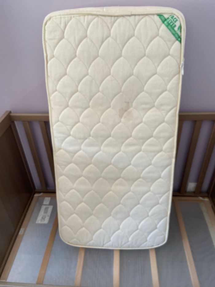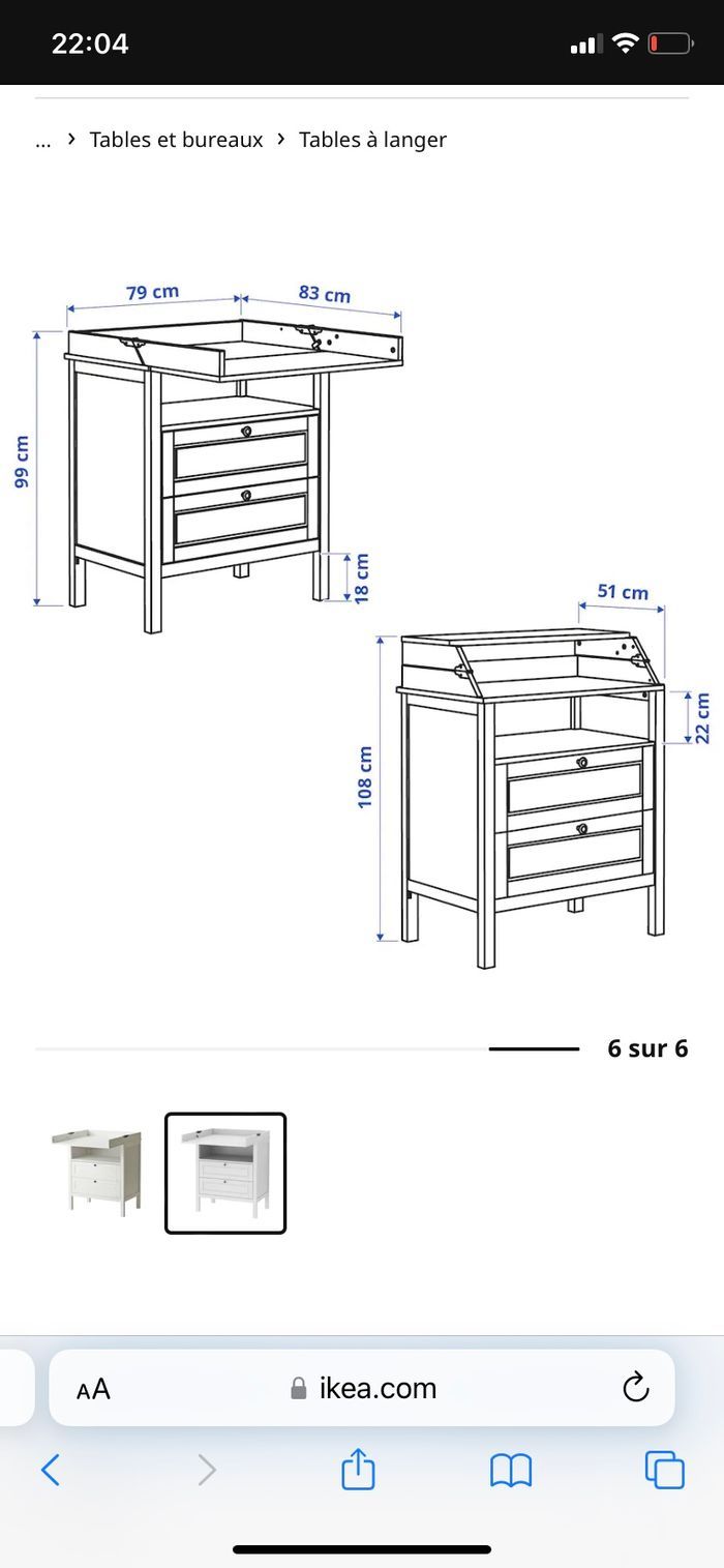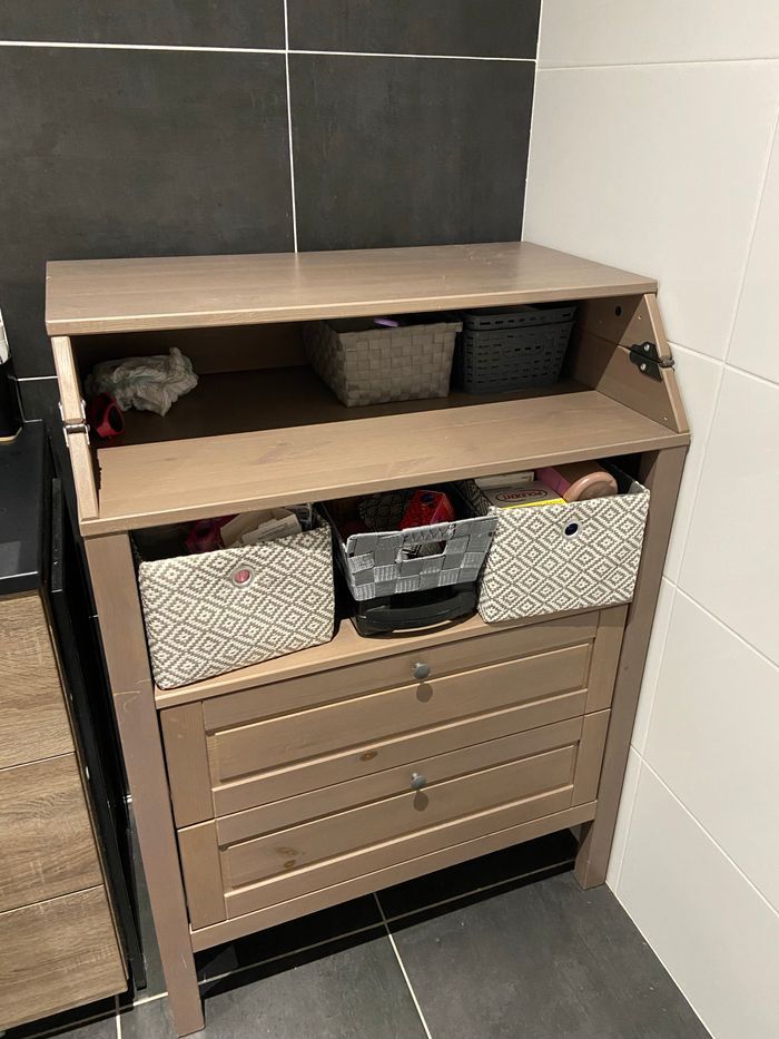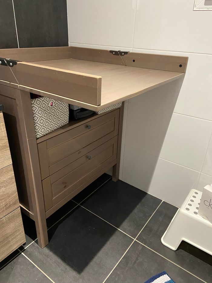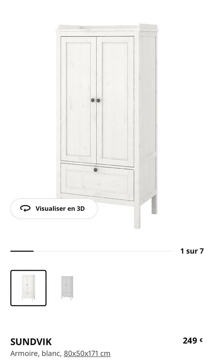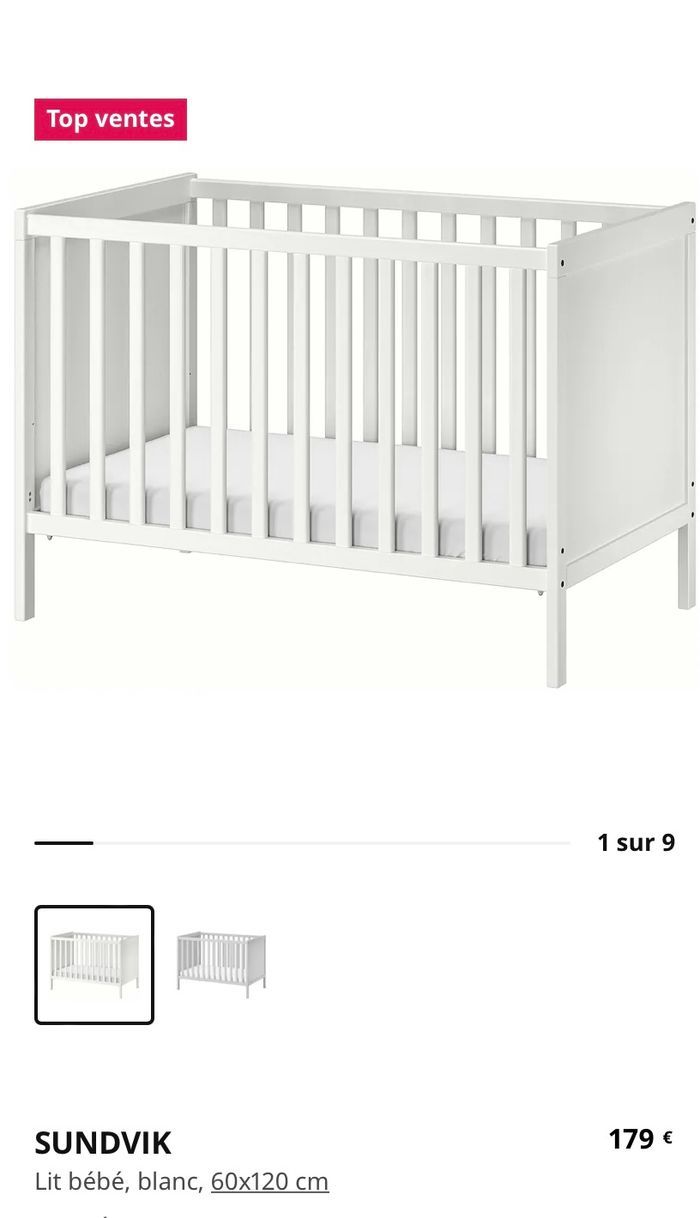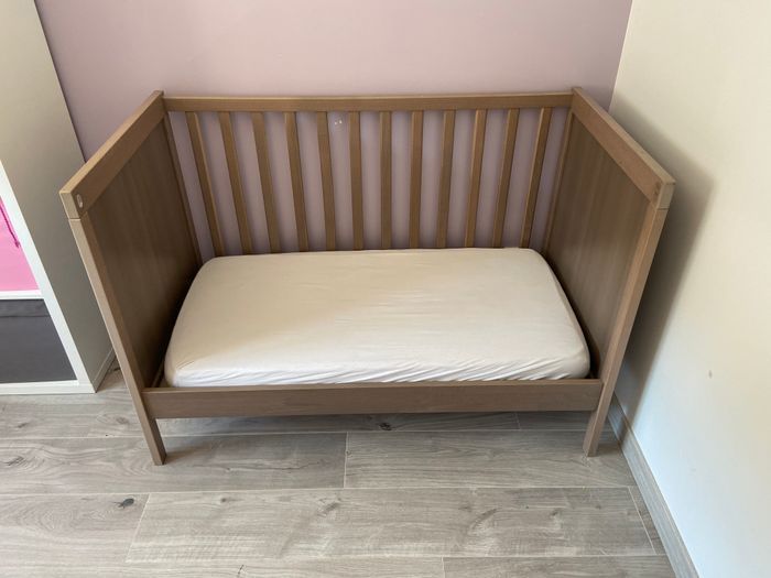 Chambre bébé Ikea Lit 120x60 réglable en hauteur et un côté amovible Commode/ table à langer 2 tiroir et plan à langer repliable Armoire 2 portes 1 tiroirs et 1 étagère + penderie à l’intérieur Une petite rayure sur la commode
