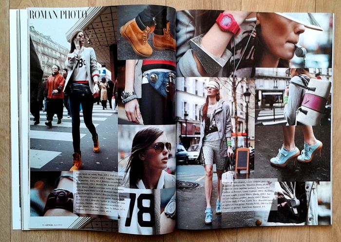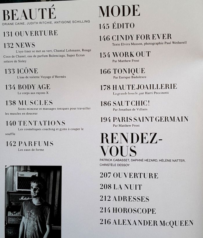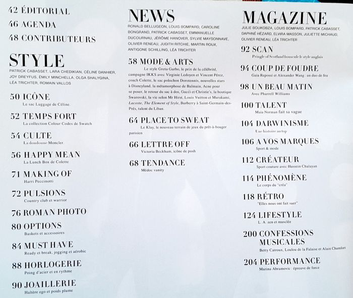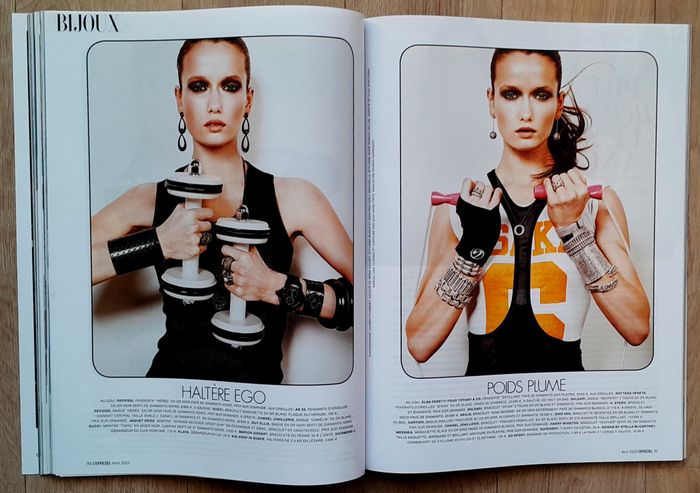 214 pages 28x22cm spécial roman photo mode, mode sport, montres, Alexander Wang et Gaia Repossi 4 pages, Maia Norman 4 pages, sport et mode et si on se mariait, rétro sport elles nous ont fait suer, lifestyle L. A. zen et musclée 6 pages, body age 6 pages, Cindy 8 pages, mode work out, mode tonique, mode bijoux la grande boucle, mode saut chic, Alain Chamfort 4 pages..