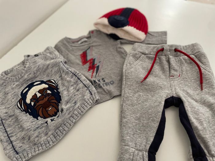 Ensemble IKKS taille 3 mois avec bonnet, jogging, t-shirt manche longue et pull Très bon état