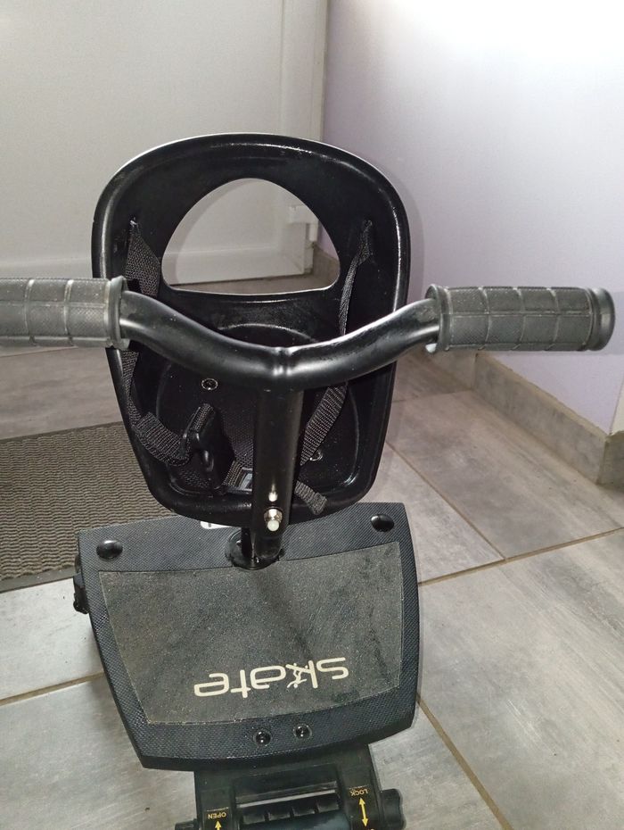 Planche + siège de la marque skate qui s'accroche derrière une poussette.