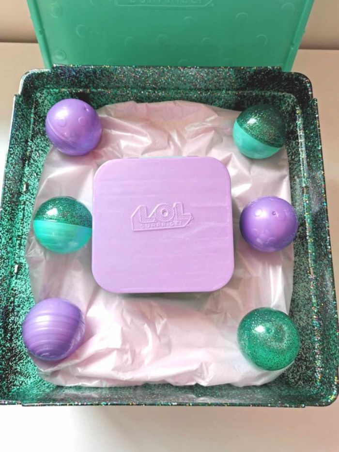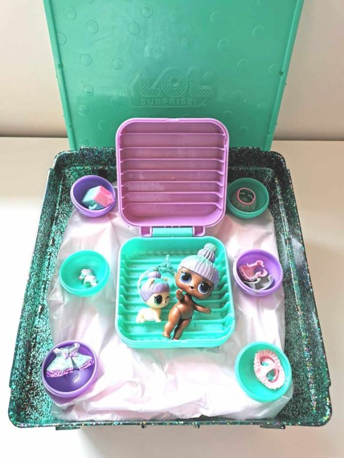 Poupée L.O.L. Surprise Deluxe Present Surprise , poupée Teal , avec ses accessoires et son animal de compagnie , un fond en papier de soie a été recréé pour remplacer le moulage en plastique qui accueillait les boules et la boite carrée , très bon état . N'hésitez pas à me demander d'autres photos ou infos complémentaires et à consulter mes autres ventes .