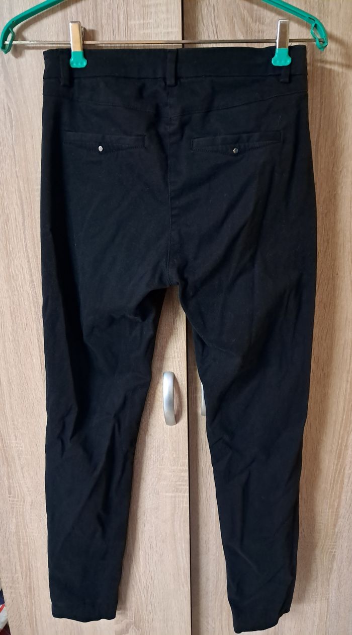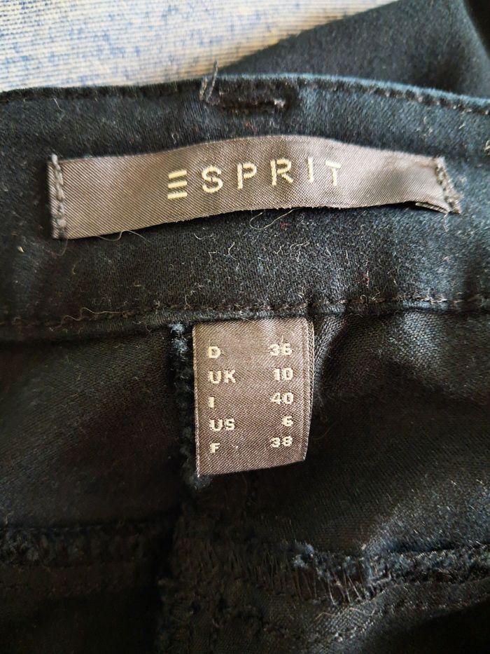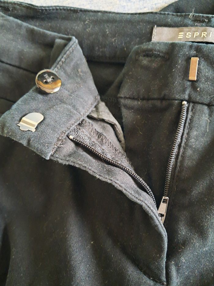 Pantalon ajusté Esprit taille 38 noir Matière très douce à l'extérieur Fermeture par agraphe, braguette et bouton Fausses poches à l'avant et à l'arrière Étiquette de composition coupée Porté plusieurs fois mais très bon état Réductions lots activées
