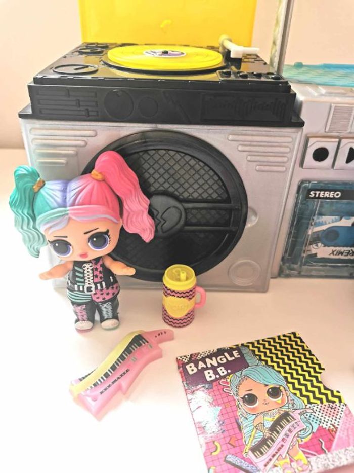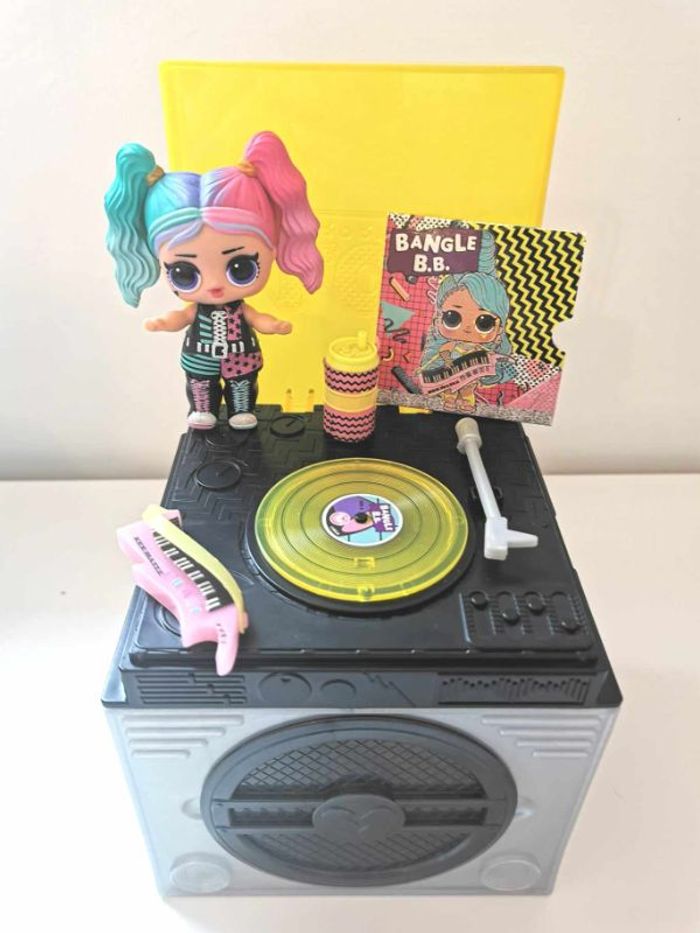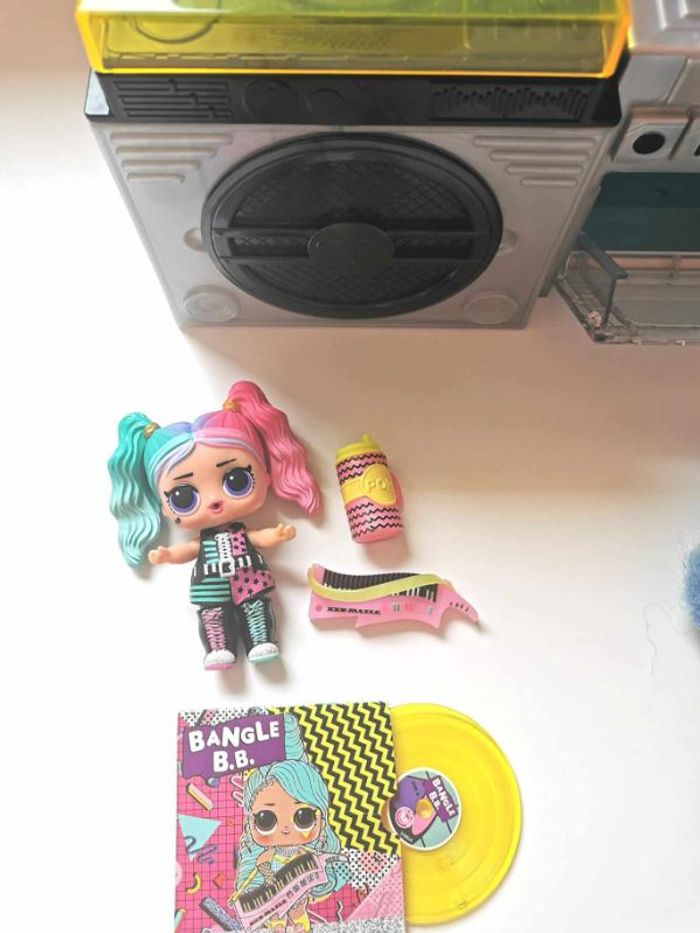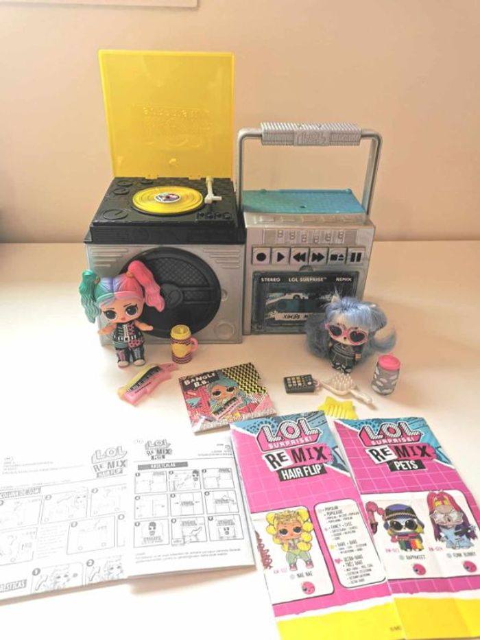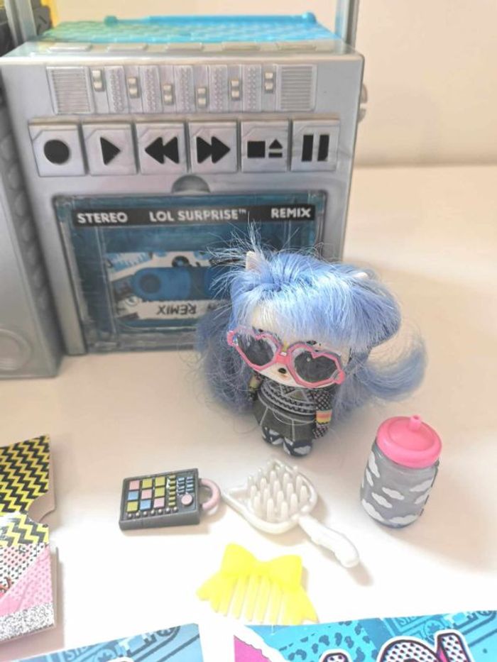 Poupée L.O.L. Surprise Remix , lot de 2 éléments : - L.O.L. Surprise Remix Hairflip , avec un mini disque à écouter ( la poupée n'est pas celle d'origine mais correspond parfaitement au thème du jouet ) - L.O.L. Surprise Remix Pets , le lecteur cassette avec sa figurine animal et ses accessoires Les deux éléments peuvent s'assembler pour former une boite à musique complète . Lot en très bon état . N'hésitez pas à me demander d'autres photos ou infos complémentaires et à consulter mes autres ventes .